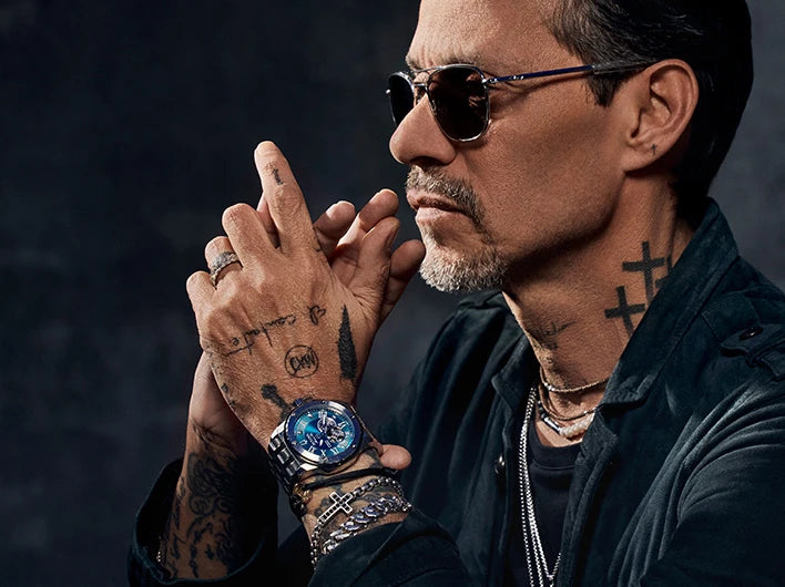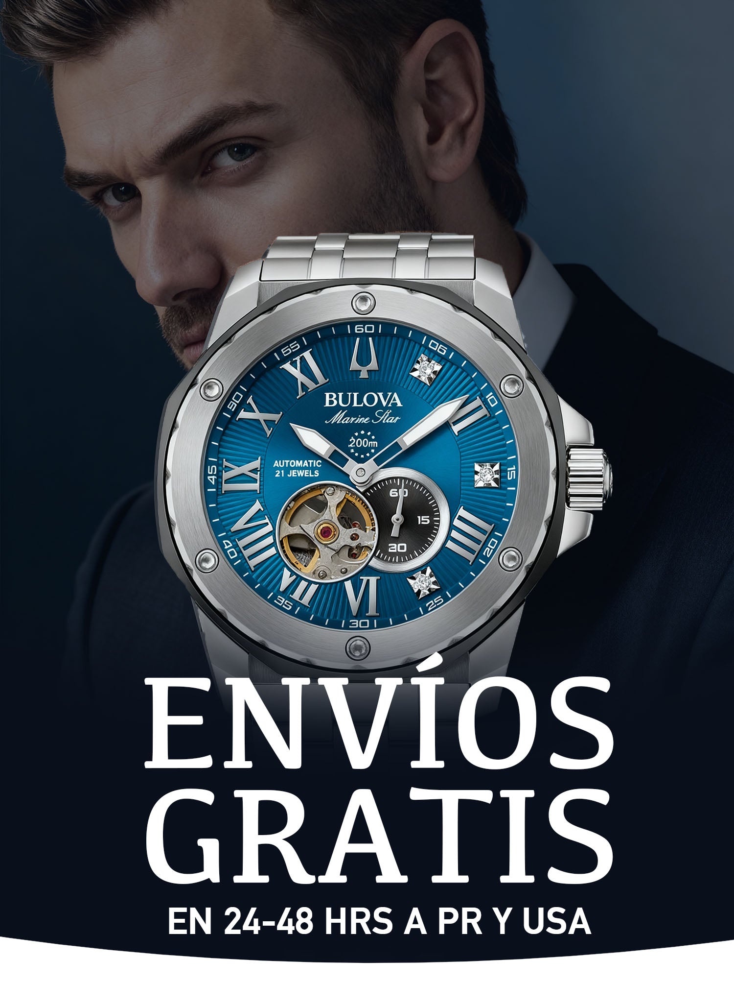 Bulova x Marc Anthony con acabado azul sunburst, detalles en diamante y movimiento automático visible. 44 mm, acero inoxidable y resistencia de 200 m. Un reloj que siempre llama la atención, por eso es un best seller.