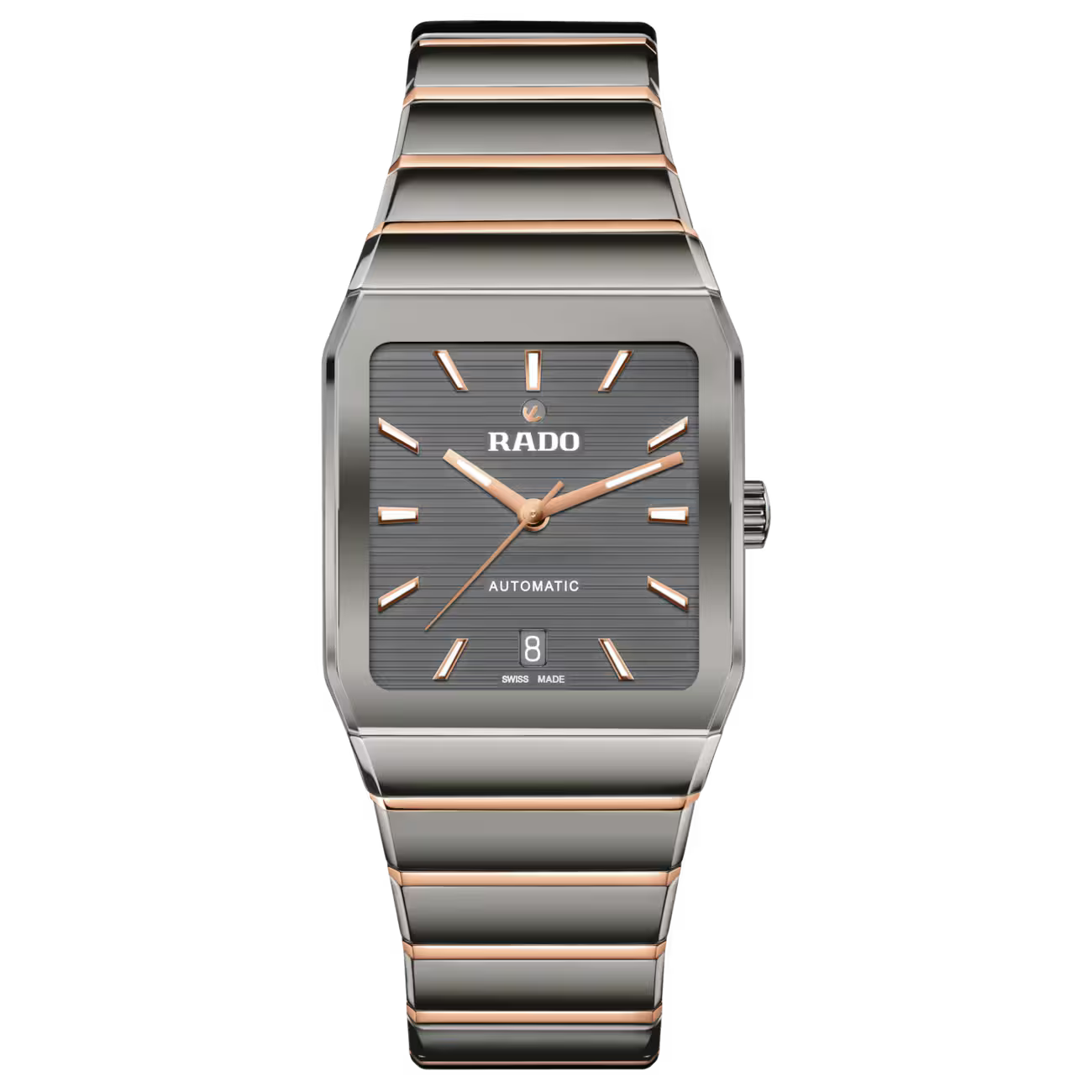 Since its debut in 1983, the Rado Anatom has stood as a symbol of groundbreaking design and ultimate comfort. Its signature feature is the cylindrical metallised sapphire crystal with beveled edges on both sides, extending seamlessly into the plasma high-tech ceramic bracelet, creating a smooth, continuous form that merges the case and bracelet into a unified, cohesive shape. Crafted from polished plasma high-tech ceramic links and polished rose gold coloured PVD coated stainless steel middle links, the bracelet is meticulously secured by a brushed stainless steel 3-fold clasp. Beneath this distinctive crystal lies a grey lacquered dial revealing a striking pattern of irregularly spaced horizontal lines. Rose gold-coloured applied hands and indexes with coated white Super-LumiNova® create a refined contrast against the dial’s depth. Crowning the dial at 12 o’clock is the iconic moving anchor, complemented by a discreet date window positioned at 6 o’clock. Beating at its heart, and exalted through the sapphire crystal caseback, is the 21-jewels Automatic R766 calibre. Finely regulated in five positions and equipped with a Nivachron™ hairspring, this movement delivers a high level of accuracy and a robust 72-hour power reserve, underlining Rado's commitment to perfection.