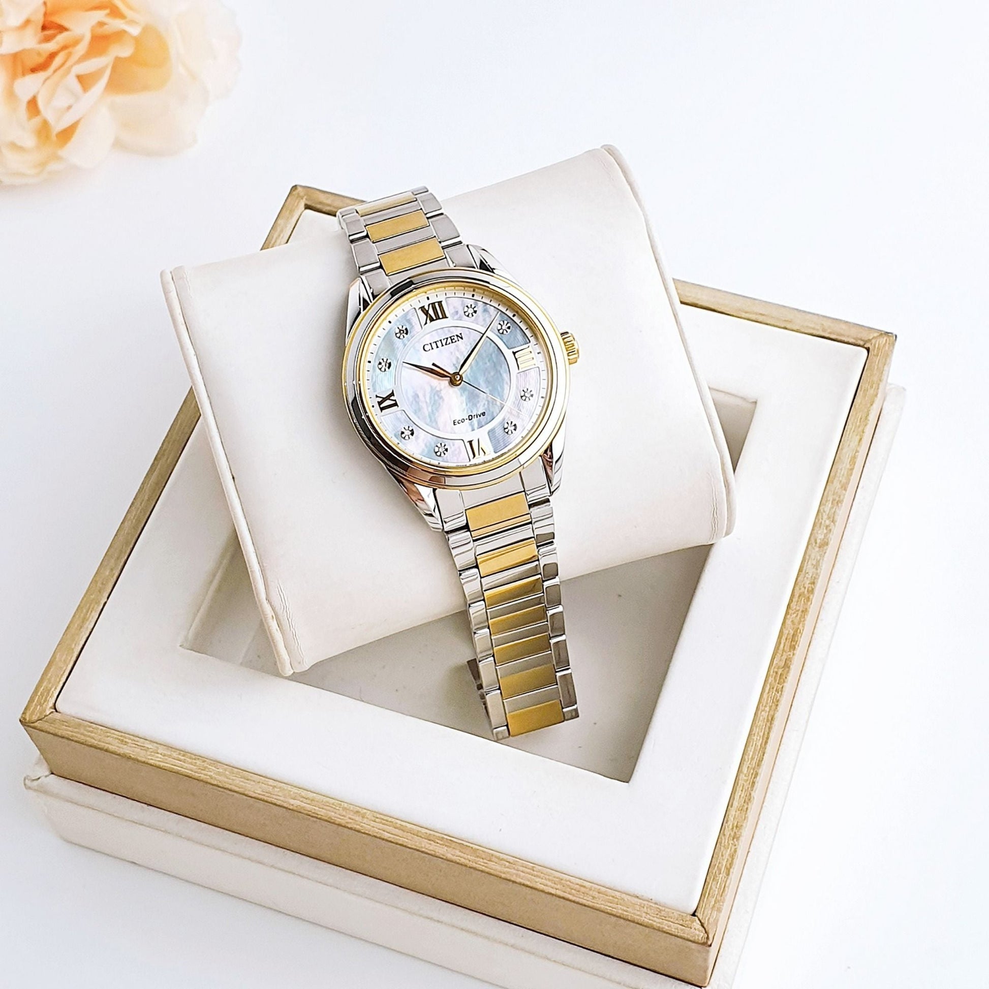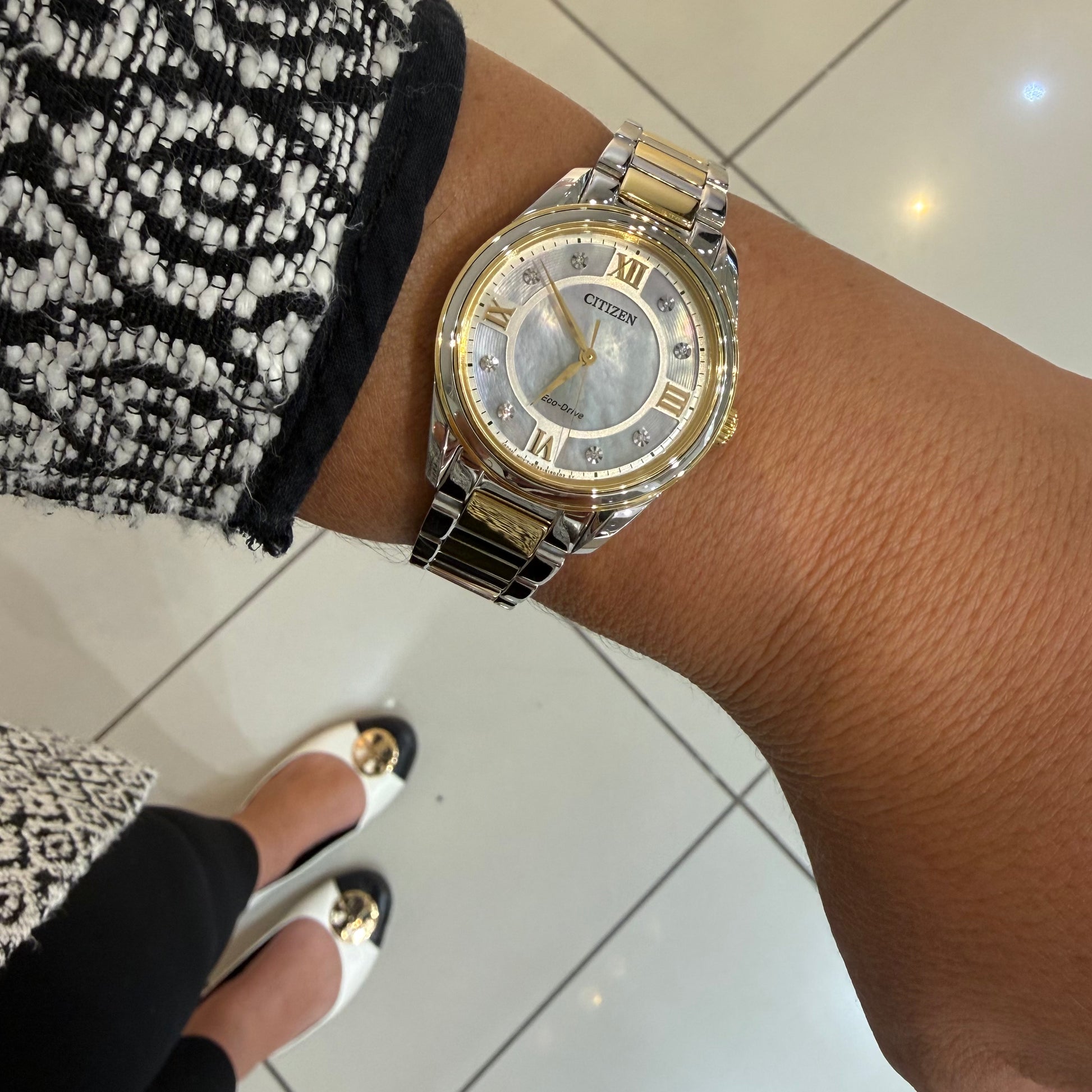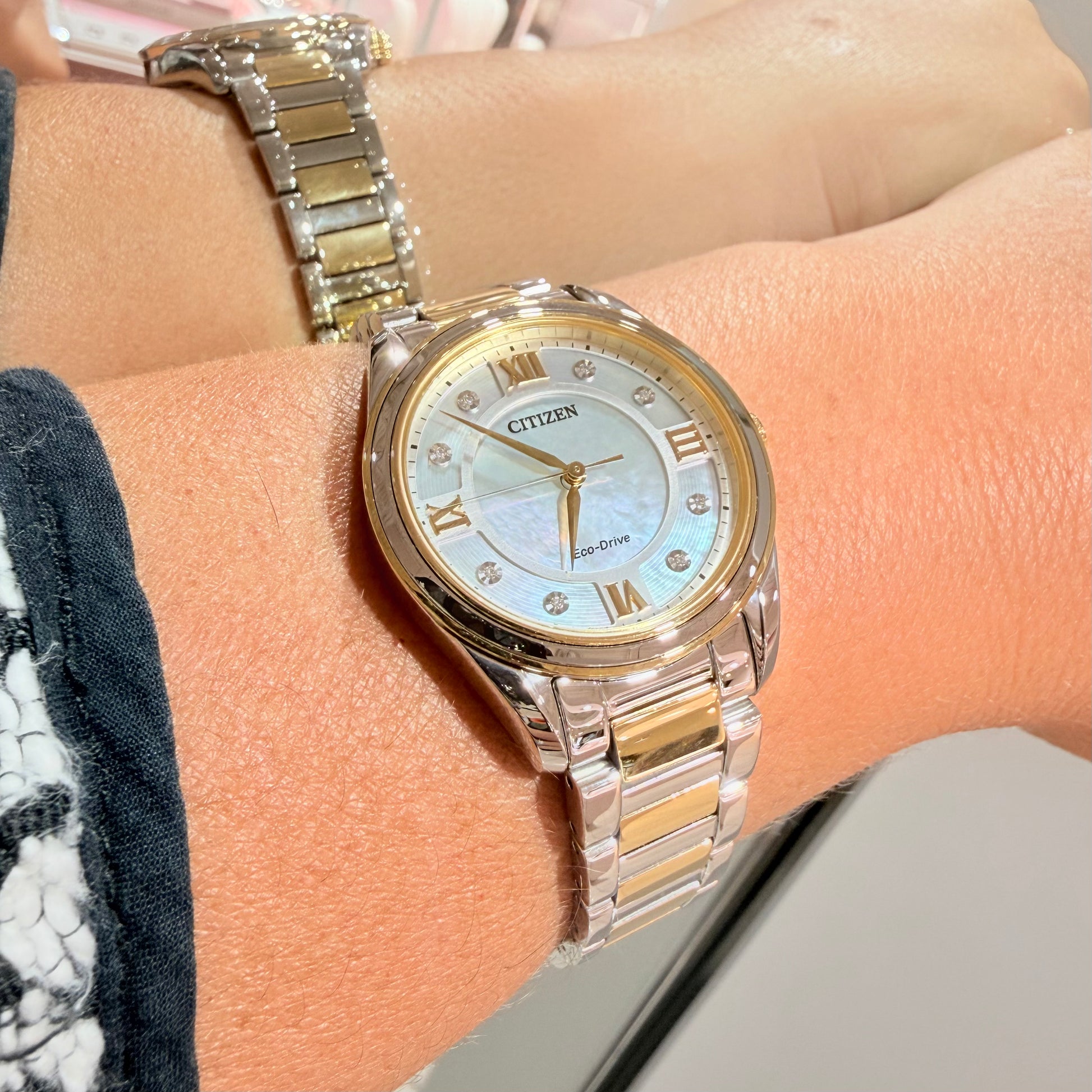 From the 32mm two-tone stainless-steel case to the two-tone bracelet with a deployment clasp, the Arezzo from Citizen marries elegant style with sporty function. It has a white three-hand dial with Roman numerals, is accented with diamonds and uses Eco-Drive technology, so it is powered by any light, never needing a new battery.