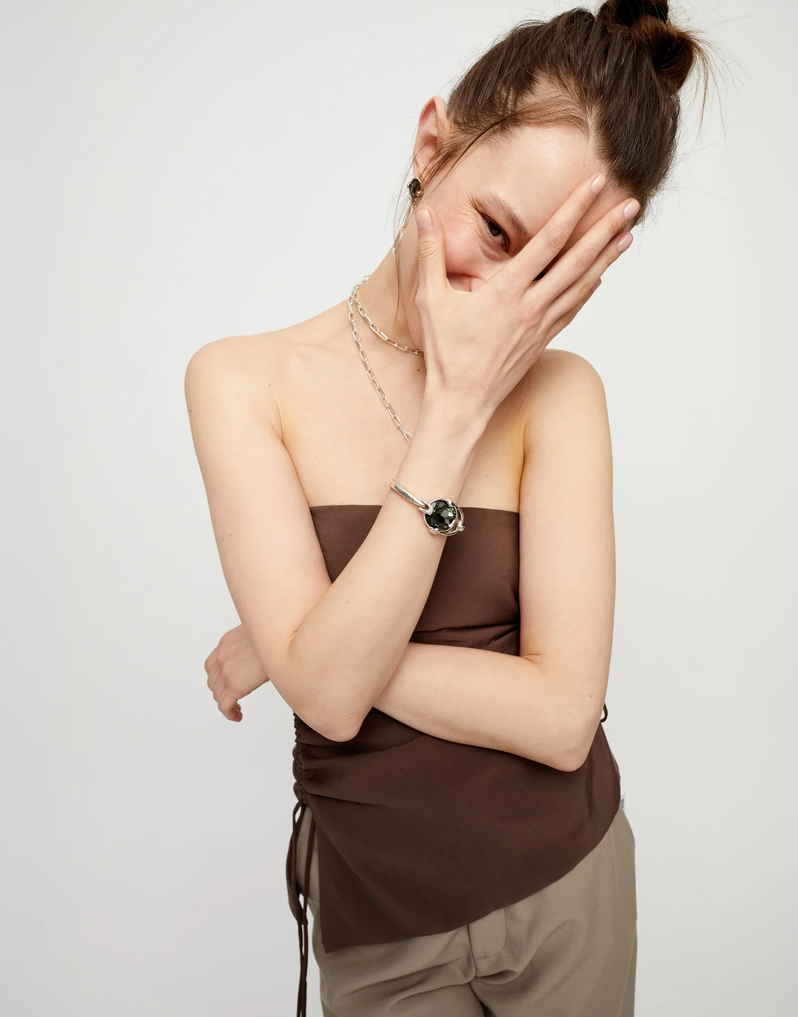 This designer bangle stands out for its robust and polished structure that frames an enigmatic faceted crystal in a deep graphite gray tone.