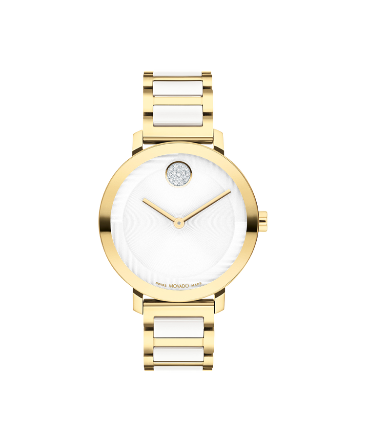 This 34mm two-hand watch features a white lacquer dial, a ceramic and steel bracelet, and our signature dot at 12 o'clock in crystal pavé.