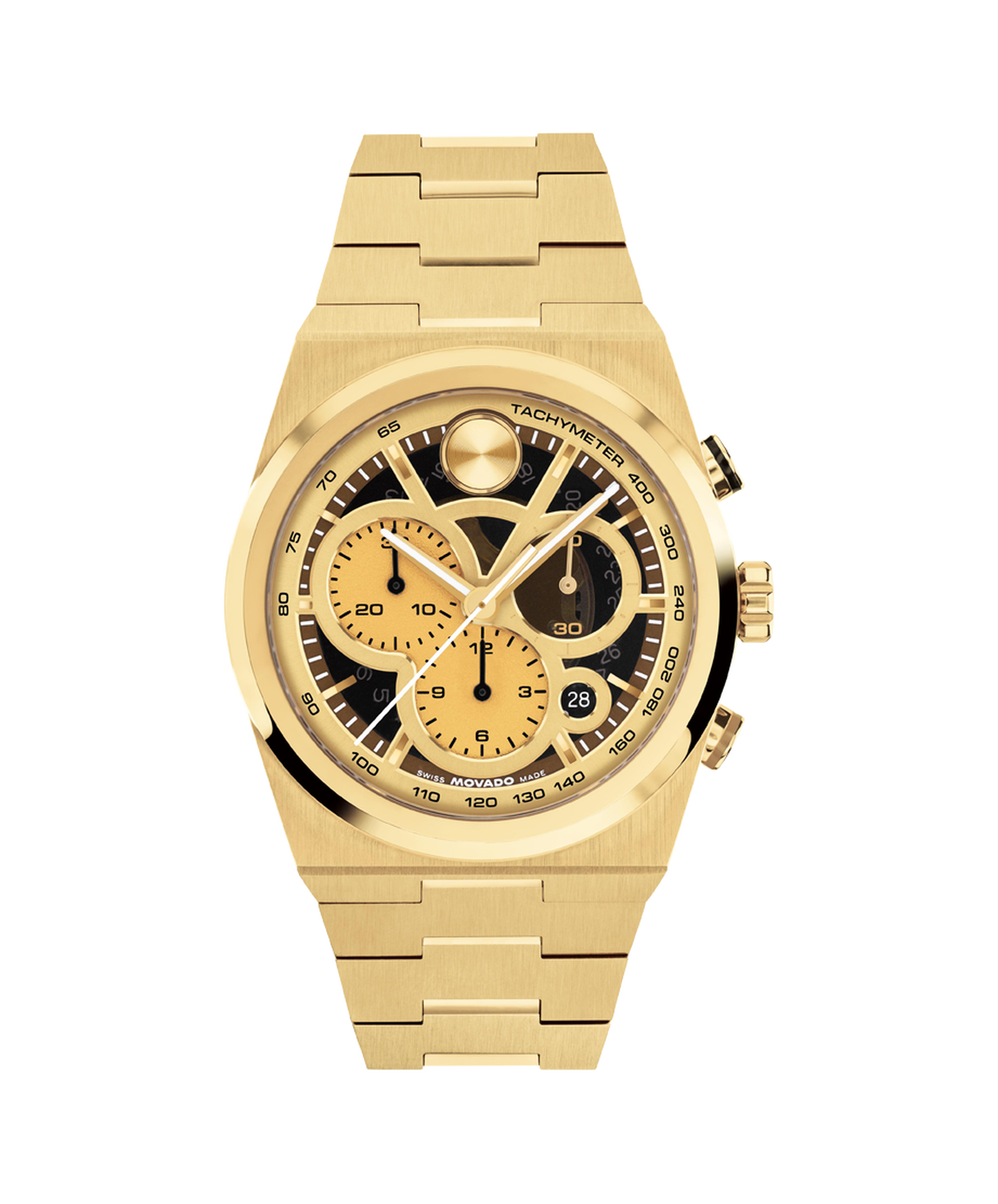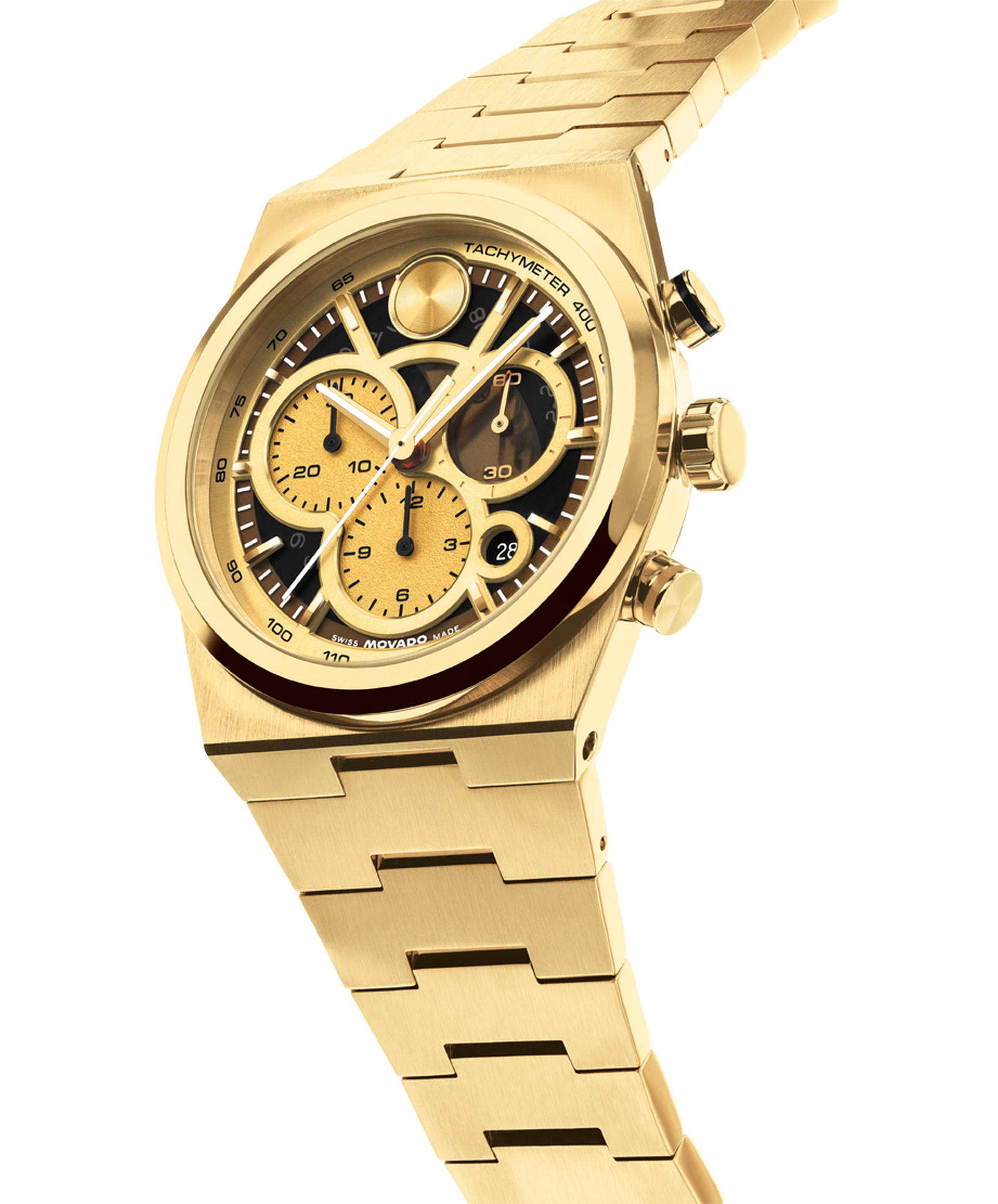 The BOLD Quest's shaped case pulls from Movado's 1970s archival design and looks to the future with an integrated bracelet.