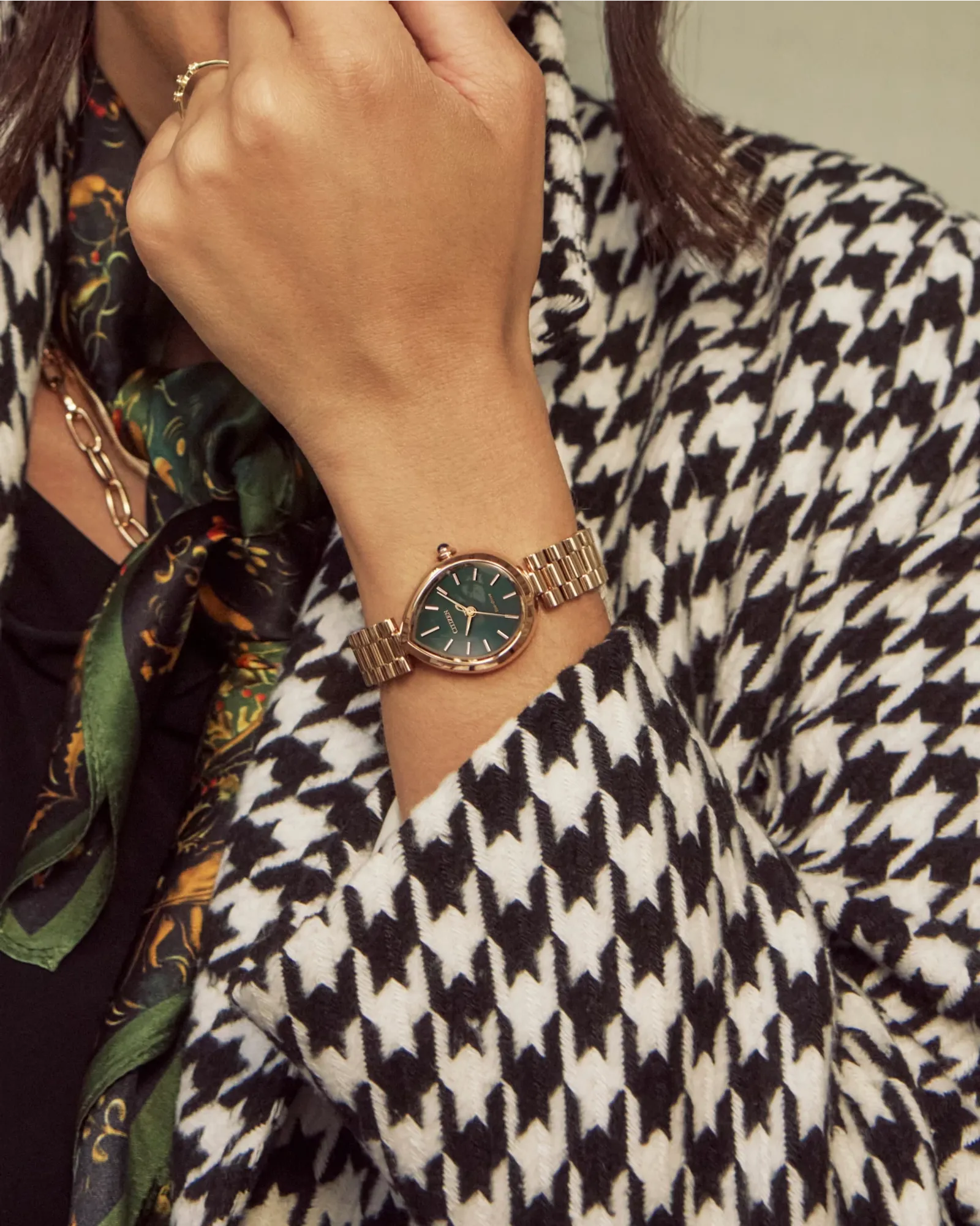 Flirty and feminine, the new Citizen L Rainell is a watch as creative and elegant as those who wear it. With subtle dimensions of 26mm by 31mm, the signature shape of the timepiece speaks for itself in an elevated rose gold-tone stainless steel. An integrated bracelet and synthetic sapphire-set crown punctuate the look. A lovely green dial follows the shape of the case, with a brushed background playing host to refined details in applied indices and matching hands. Sustainably powered by any light with our proprietary Eco-Drive technology that never needs a battery. Water resistant up to 50 meters. Caliber E031.