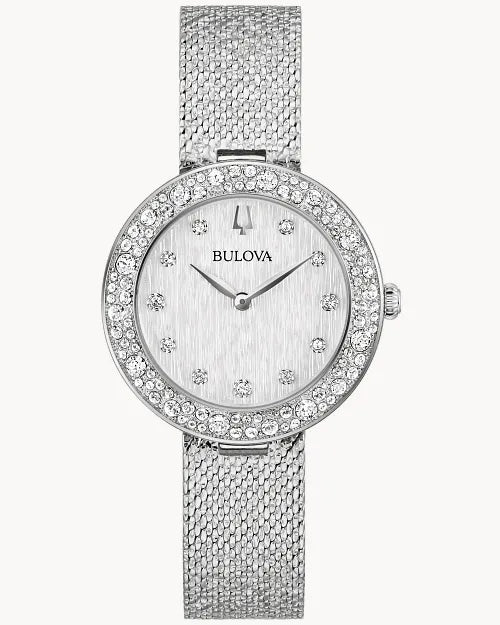 Step into the golden age of glitz and glamour with the luxuriously appointed women’s Champagne Crystal timepiece. Meticulously set with 103 dazzling Austrian crystals, the silver-tone stainless steel case’s bezel conjures the effervescence of champagne, while the glittering silver-tone fine mesh strap shimmers with sophistication and offers unrivaled comfort with its adjustable sliding buckle. The brilliant silver-tone dial is no less spectacular, with a refined texture, 11 crystal hour markers, and polished silver-tone hands creating a truly magnificent aesthetic. A timeless merging of style and grace, the Bulova ladies’ Phantom timepiece elevates every ensemble and wardrobe.