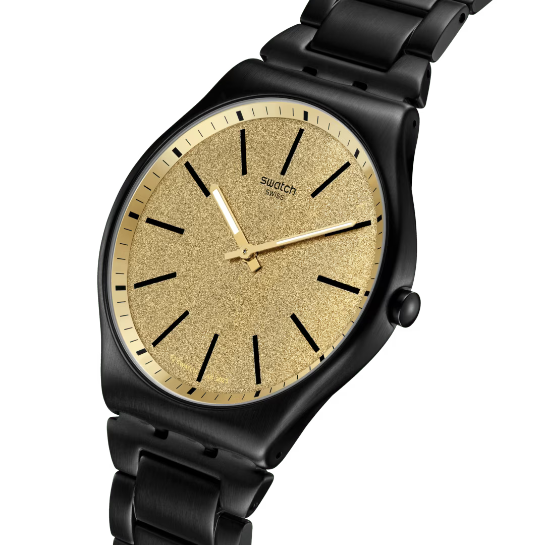 This ultra-slim stainless steel watch is a distinctive timepiece with a golden-colored metallic Reflective Chromatics-printed dial. It features black indexes, golden-colored hands that glow in the dark and a mineral glass. It has a brushed-black PVD case and matching adjustable bracelet.