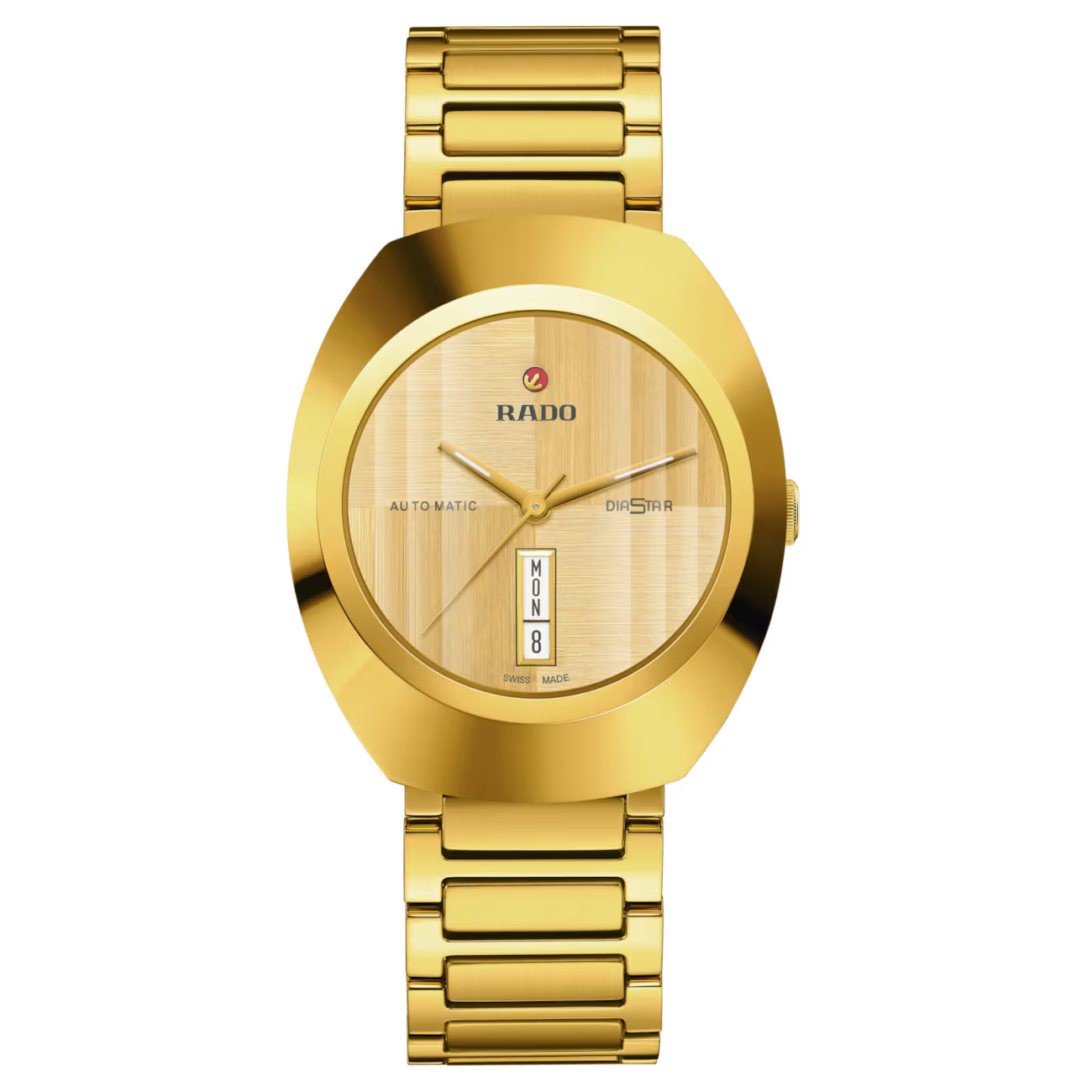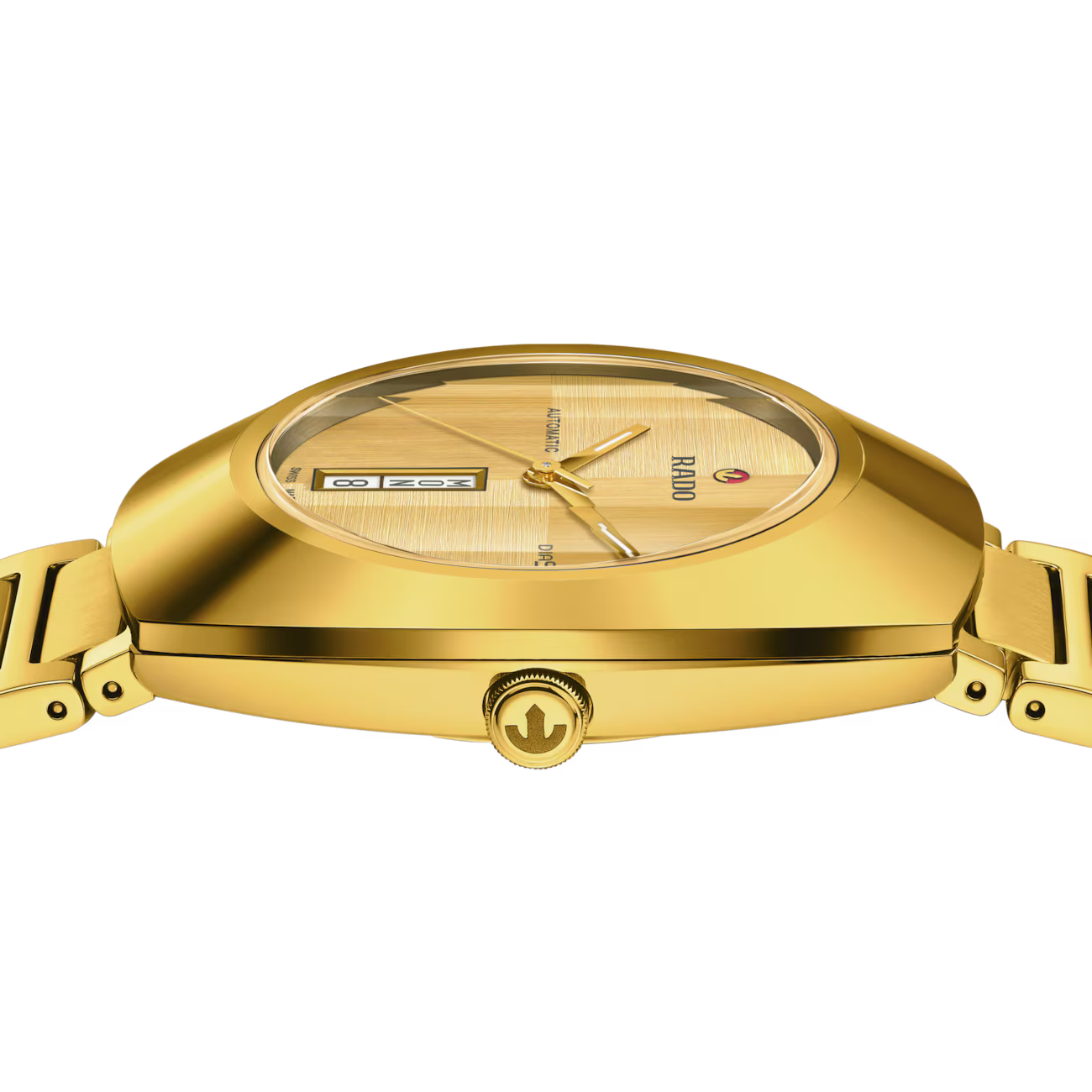 The unique DiaStar Original has a diameter of 38 mm and is water resistant down to 100 m. Framed by an ultra-shiny yellow gold-coloured Ceramos™ coiffe with polished angles and detailing set over a matching, yellow gold-coloured PVD coated stainless-steel case, this beautiful watch is rounded off with a parallel-stripe-faceted sapphire crystal. Specifications include a gold brushed dial with two directions, yellow gold-coloured hands with white Super-LumiNova®, and a white day date display. The Rado R764 automatic movement offers 80 hours of power reserve, with an antimagnetic Nivachron™ balance spring. The bracelet is made of yellow gold PVD coated polished and brushed stainless steel