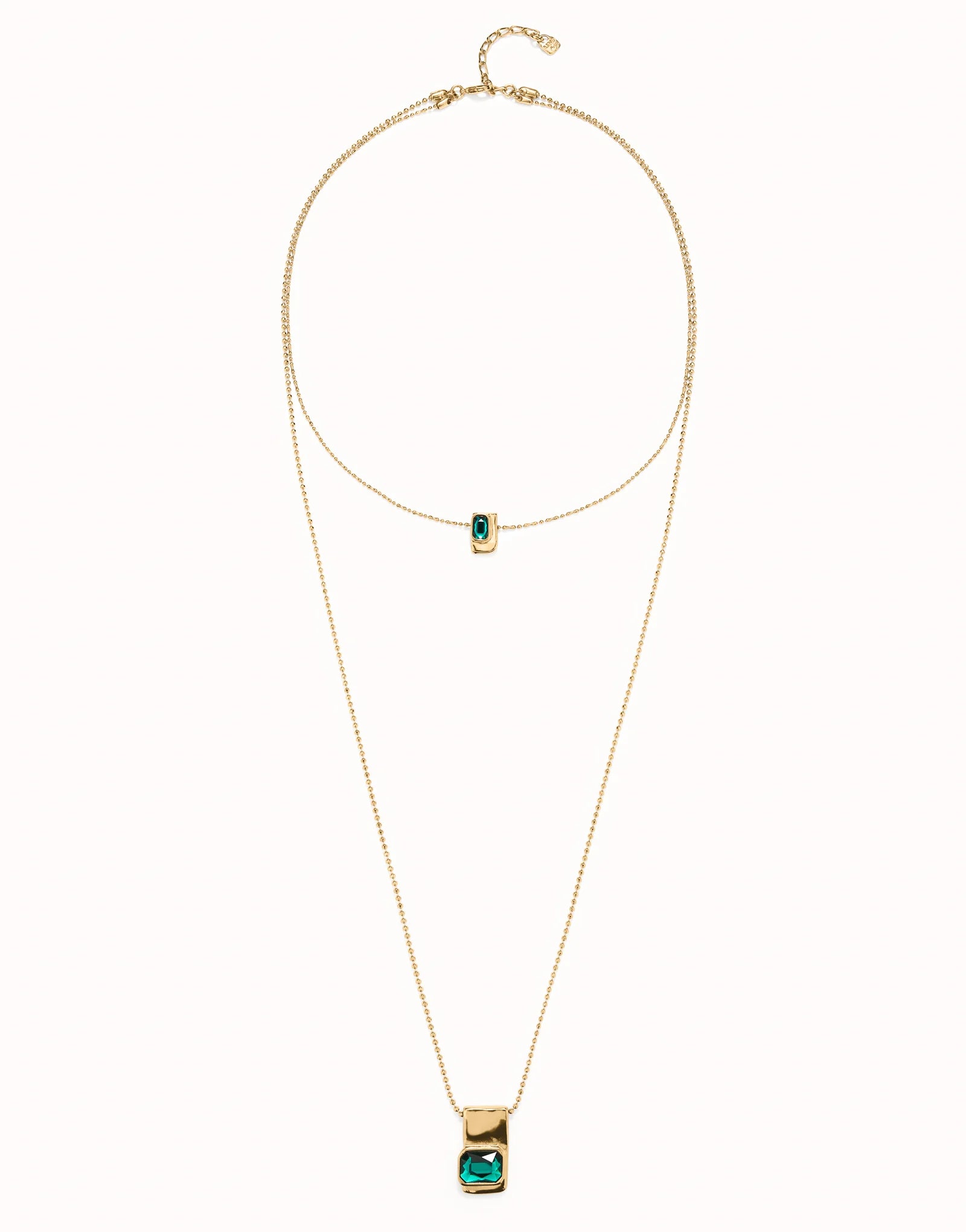 Double 18K gold-plated chain with two different lengths and faceted green crystals. Made in Spain with a 100% handmade process.These pieces of jewelry are an art exhibition composed of bracelets, rings, necklaces and earrings, where each piece is a work of art in which we find emerald style cut crystals and pieces with layers of geometric shapes. Discover the collection ser magnética.