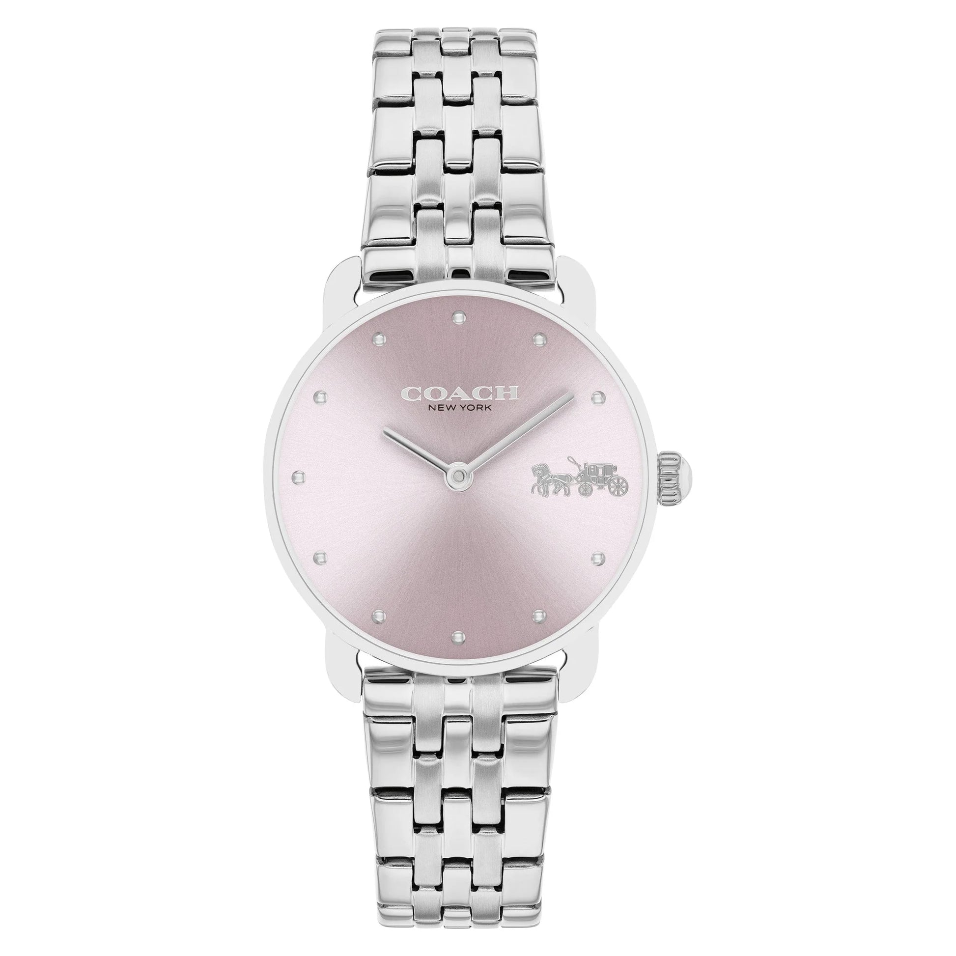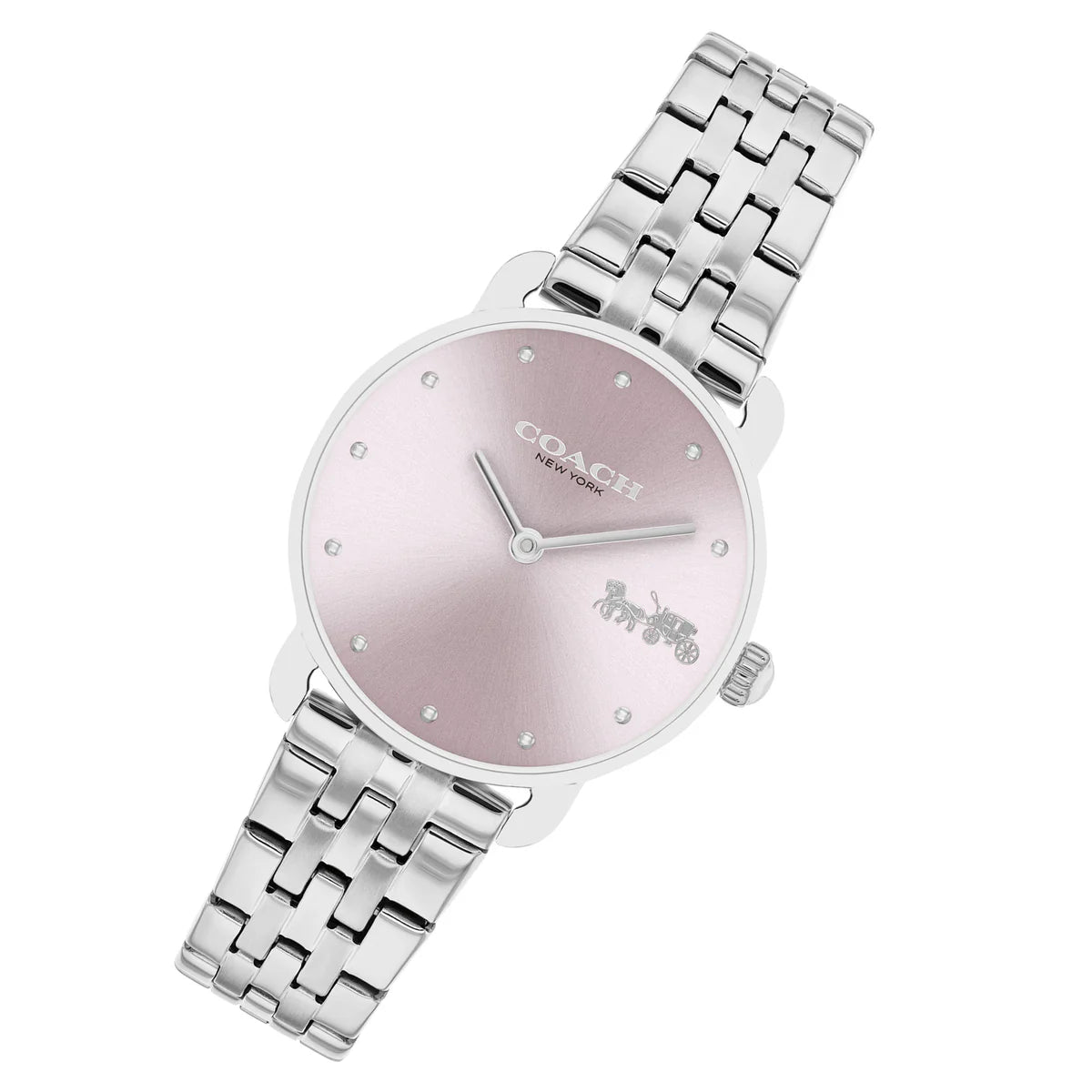 Introducing the Coach Stainless Steel Pink Dial Women's Watch - 14504301, featuring a high-quality quartz movement and a sleek and stylish design. With a 28mm case diameter and a slim 7.2mm case thickness, this watch is perfectly sized for any occasion. The 14mm band width and durable stainless steel strap add a touch of sophistication. The vibrant pink dial and mineral crystal material create a stunning visual appeal. And with 3 ATM water resistance and a secure push-button deployment clasp, this watch is both functional and fashionable. Elevate your style with this must-have timepiece!