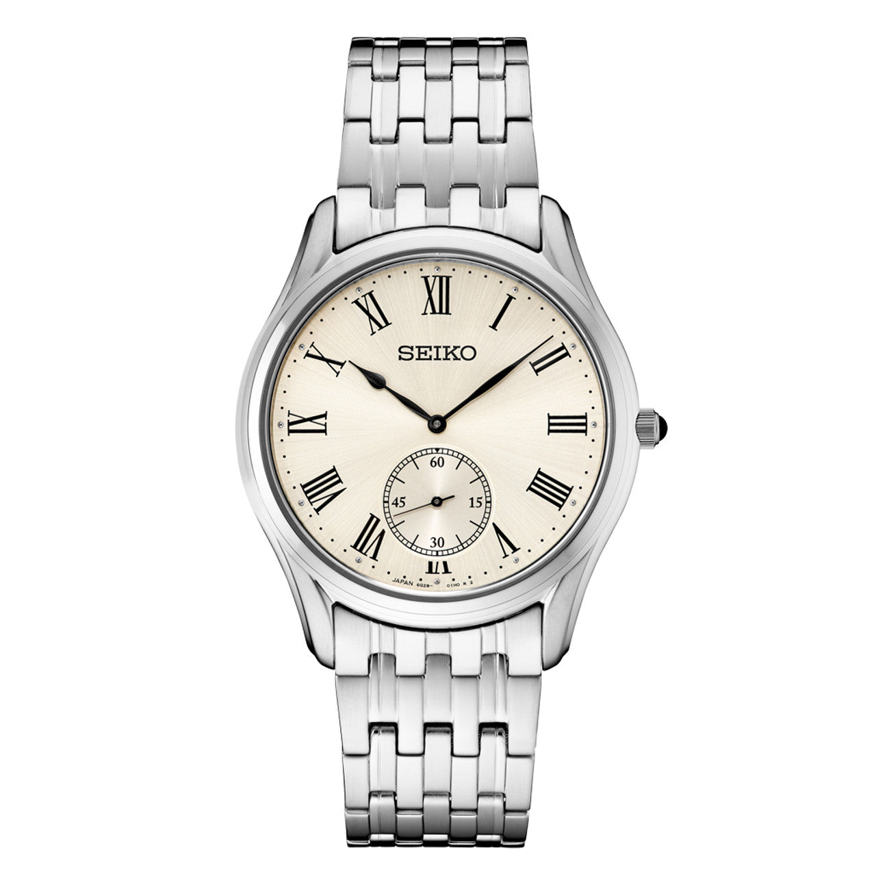 From the Essentials Collection. Offering classic dress/sport designs, in two sizes to suit anyone’s personal style, the Essentials Collection provides the ideal solution for everyday wear. Crafted of stainless steel with a scratch-resistant sapphire crystal, classic cabochon crown, and tri-fold push button release clasp this sophisticated design features an antique ivory dial with elegant Roman numerals, finely shaped hands and a seconds subdial. 5 bar, 50M Water Resistant