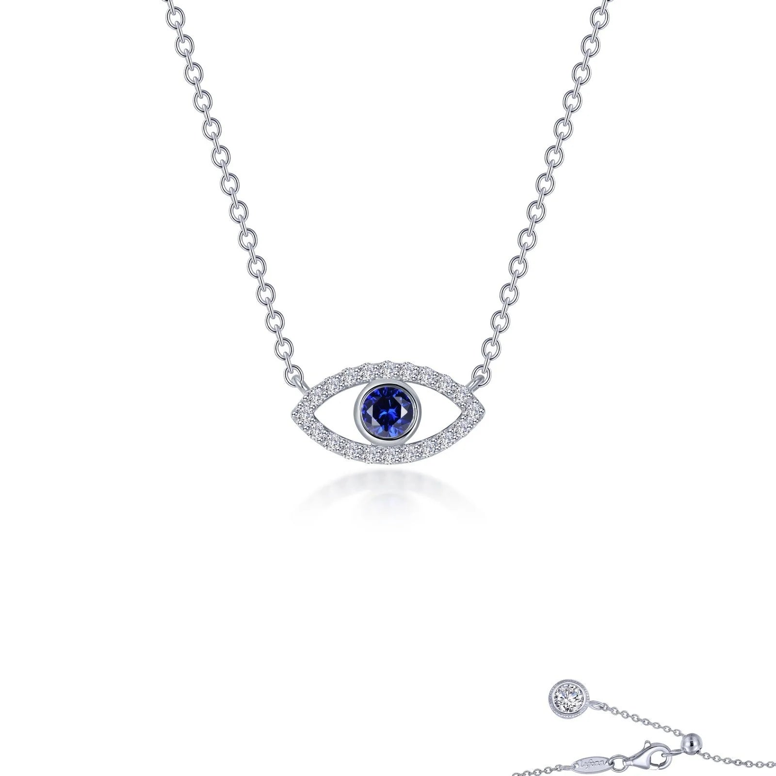 Fun and playful. This adjustable evil eye necklace features a fancy lab-grown blue sapphire with Lafonn's signature Lassaire simulated diamonds. The necklace is in sterling silver bonded with platinum. Lab-grown sapphires have the exact same chemical, mineral, and optical properties as natural sapphires which vary in color, texture and pattern. We make every effort to keep our lab-grown sapphire stone colors consistent. However, all lab-grown sapphires may not be exactly as shown on the website. Stones may appear lighter, darker or have natural variations.