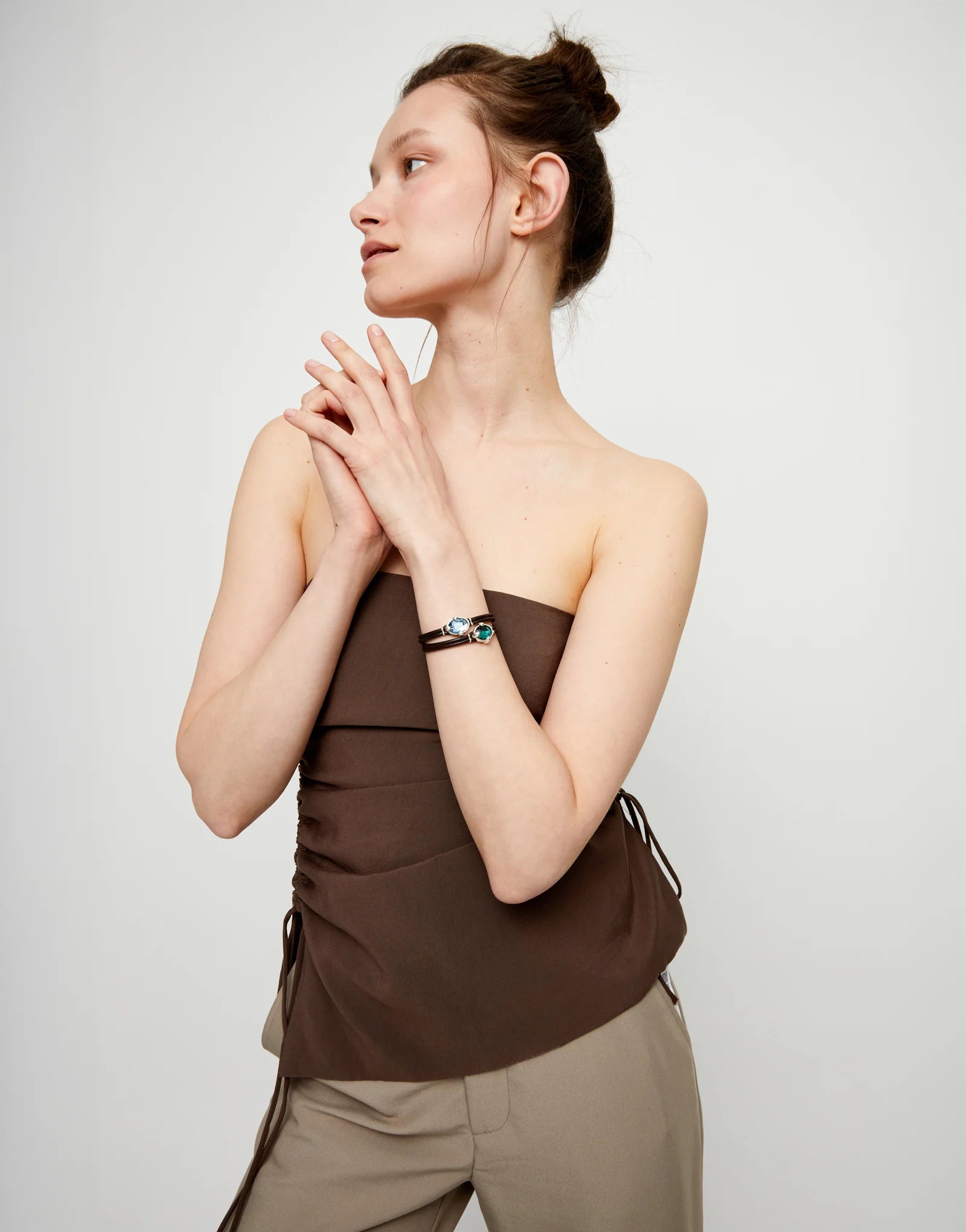 This unique piece of jewelry features a double brown leather strap design, which adds a rugged, earthy character, coupled with a center element that frames a dazzling faceted crystal in a deep blue hue.
