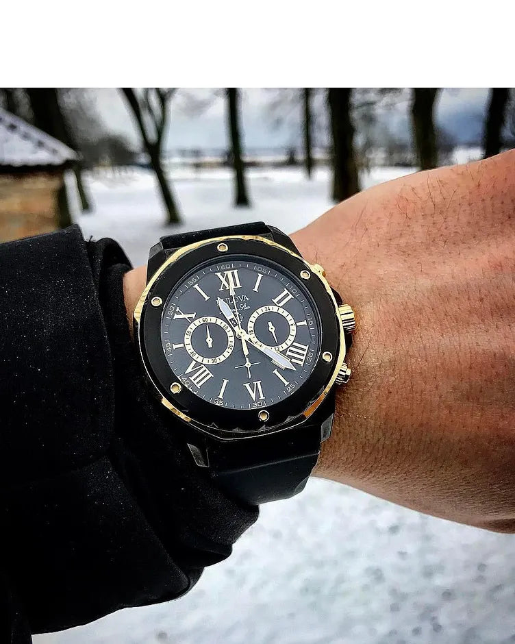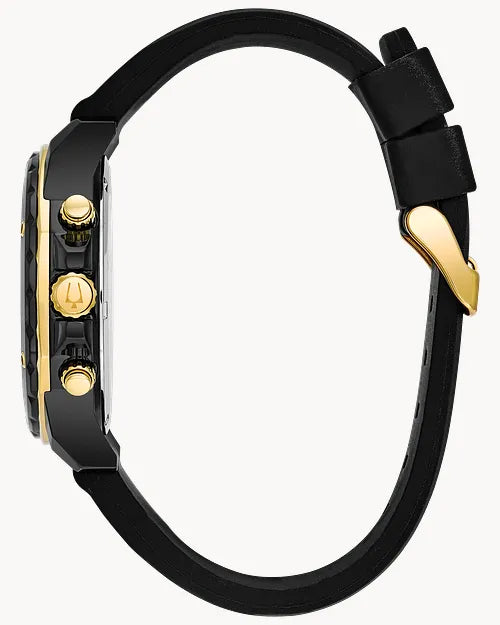 From the Marine Star Collection. Six hand chronograph with calendar in black IP and gold-tone stainless steel with black dial, flat mineral glass, screw-back case, black silicon strap with 3-piece buckle closure.