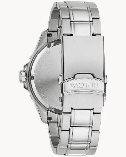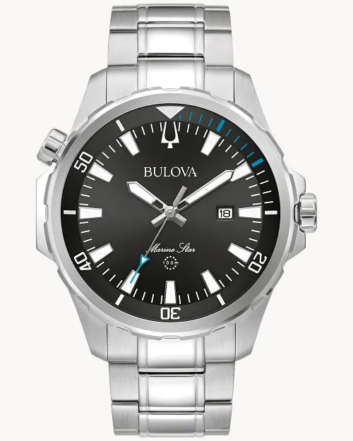 From the Marine Star Collection, summon the high seas in elevated style with the new Marine Star men’s watch. The clean, sporty design in polished silver-tone stainless steel features a black sunray dial with luminous hands and markers and a calendar. This timepiece also has a fold-over buckle closure and is water resistant to 100 meters. For a Bulova timepiece that makes a standout statement, the Marine Star is the perfect choice.
