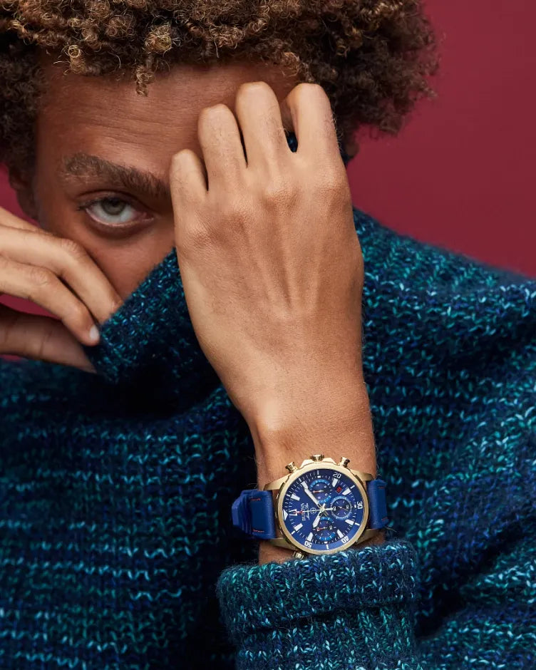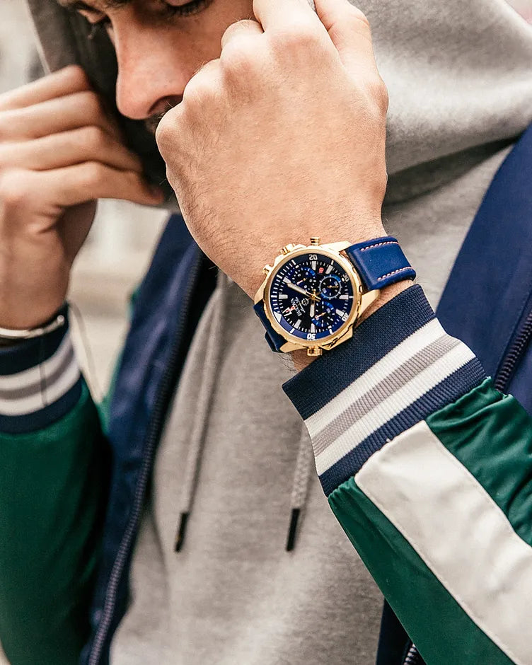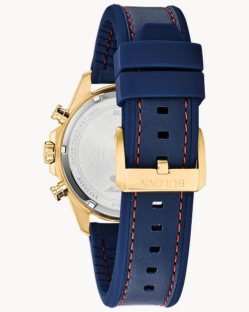 From the Marine Star Collection. Six-hand chronograph function with calendar, gold-tone stainless steel case with rotating dial ring to measure elapsed time, blue dial with gold-tone accents, flat mineral glass, screw-back case, blue leather and silicone strap with red stitch detail and three-piece buckle closure, and water resistance to 100 meters.