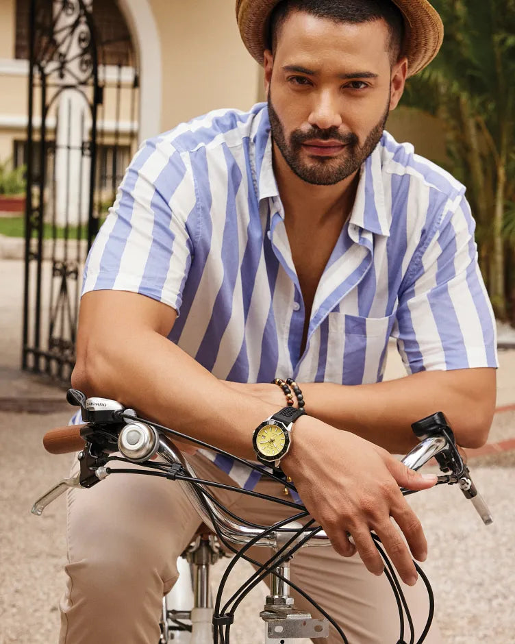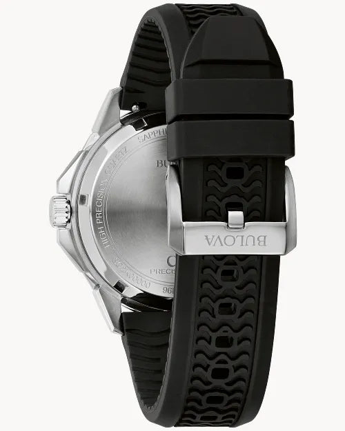 An incredibly bold design, this men’s Bulova Marine Star Precisionist sport watch pushes the limits with Bulova’s cutting edge technology and a strikingly modern case. Defined by a rugged, angular profile, the 43mm stainless steel case features brushed facets and polished accents, with a unidirectional timing bezel with a ceramic insert, a sapphire crystal, and a screw-down crown ensuring 200m water resistance. The vibrant yellow dial takes its inspiration from the undulating crests of the ocean, with a wave pattern accented by applied hour markers and a bold handset, all featuring luminescent material for unrivaled legibility in all conditions. A date window is positioned at 3 o’clock, while the red-tipped seconds hand sweeps smoothly around the dial thanks to Bulova’s proprietary Precisionist movement, a revolutionary 8-jewel quartz mechanism vibrating at a remarkable 262kHz and accurate to seconds per year with increased resistance to temperature changes. Paired with a durable silicone strap with a pin buckle closure, this men’s Bulova timepiece is equipped to handle everything from the office to the ocean.
