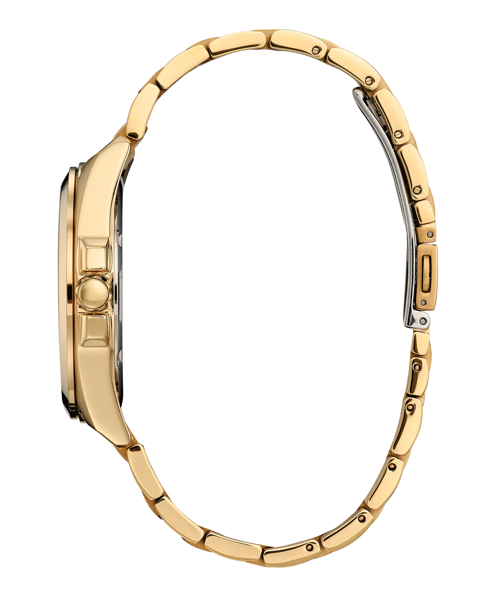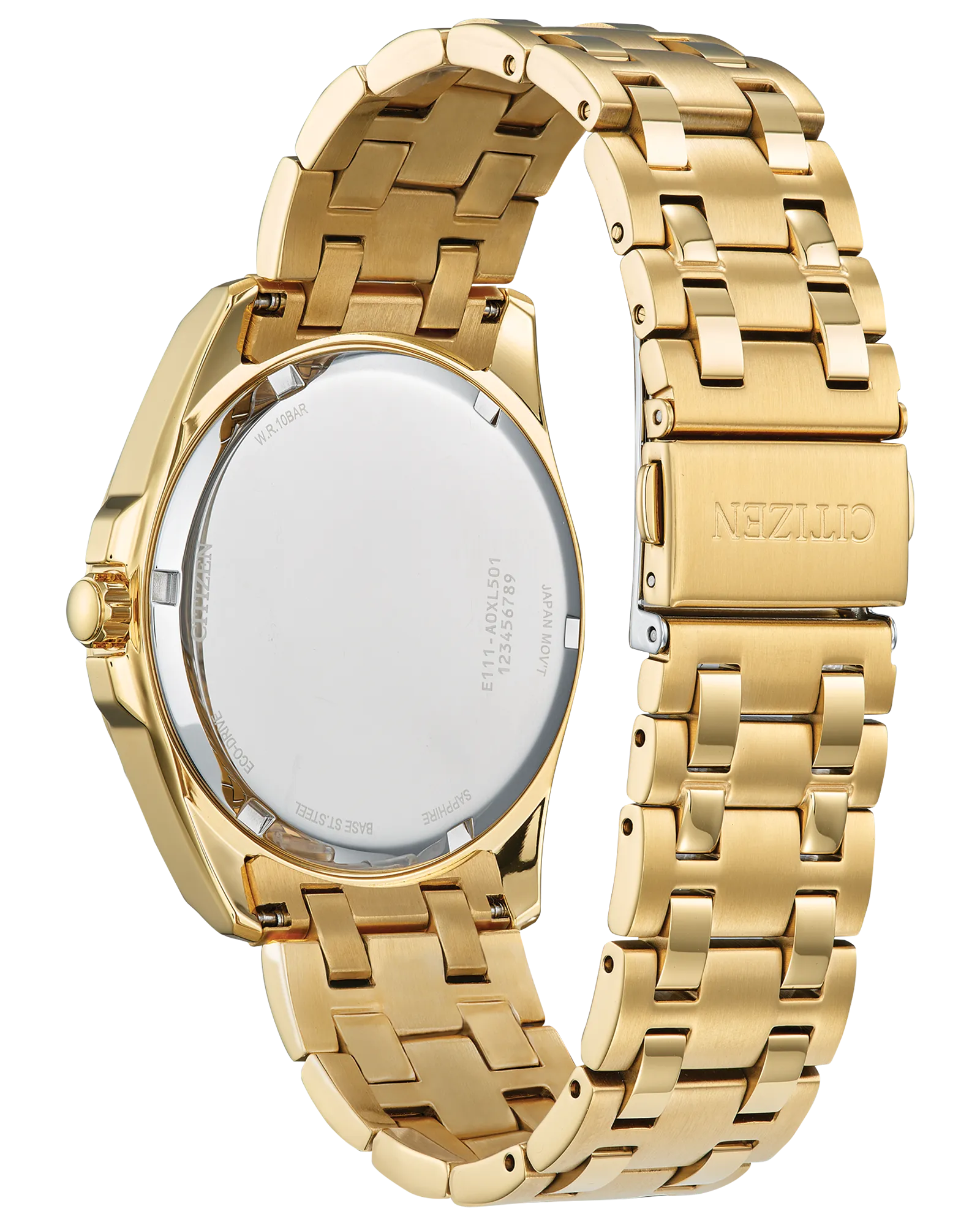 Make a distinctive style statement. Featuring a gold-tone stainless steel case and a blue 3-hand dial encased in sapphire crystal, this men’s timepiece is a combination of functional simplicity with a touch of elegance. The gold-tone stainless-steel bracelet has a fold over clasp with push buttons, giving the watch an understated refinement. Water resistant to 100 meters and sustainably powered by any light with Eco-Drive that never needs a battery.