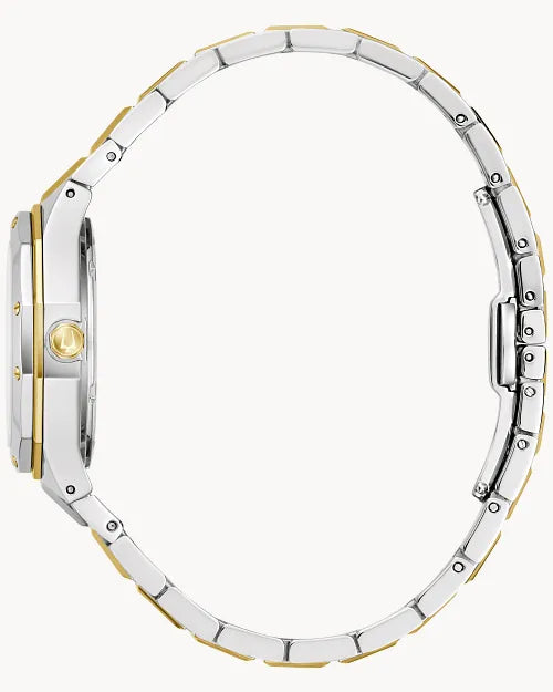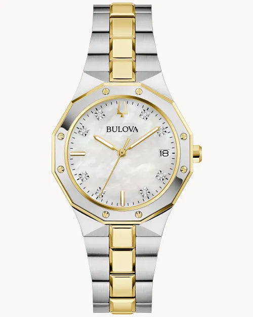 Bold, elevated design characterizes this Classic Bulova Prestige women’s timepiece that balances bold design with an elegant presence. The watch features a faceted 32mm gold- and silver-tone stainless steel case with a geometric bezel, flat sapphire crystal with anti-reflective coating, 100m of water resistance, and a chamfered 3-link bracelet with brushed and polished finishes and a push-button deployant closure. The lustrous mother-of-pearl dial has gold-tone hands and applied markers with Super-LumiNova luminescent fill, 8 dazzling diamonds, and a date display. Striking in both its modernity and its sophistication, this Bulova ladies’ watch is an ideal companion on any wrist.