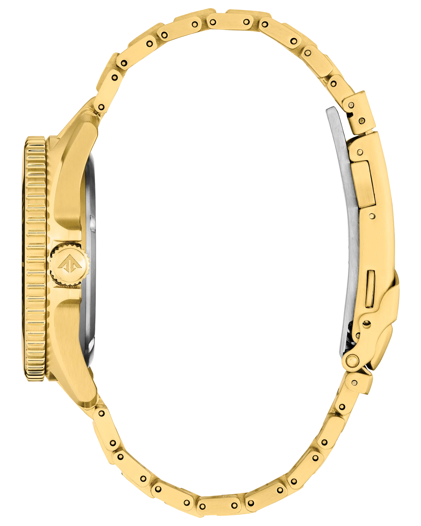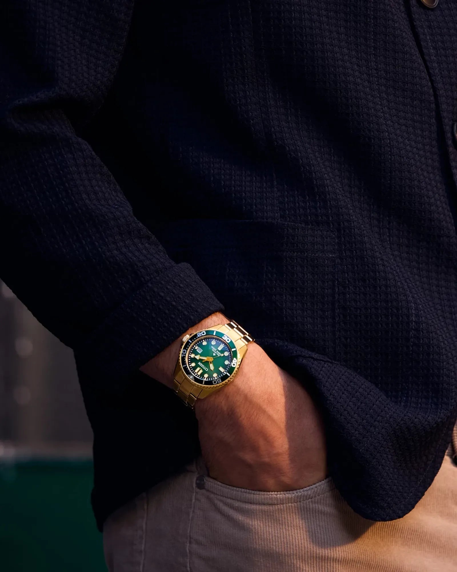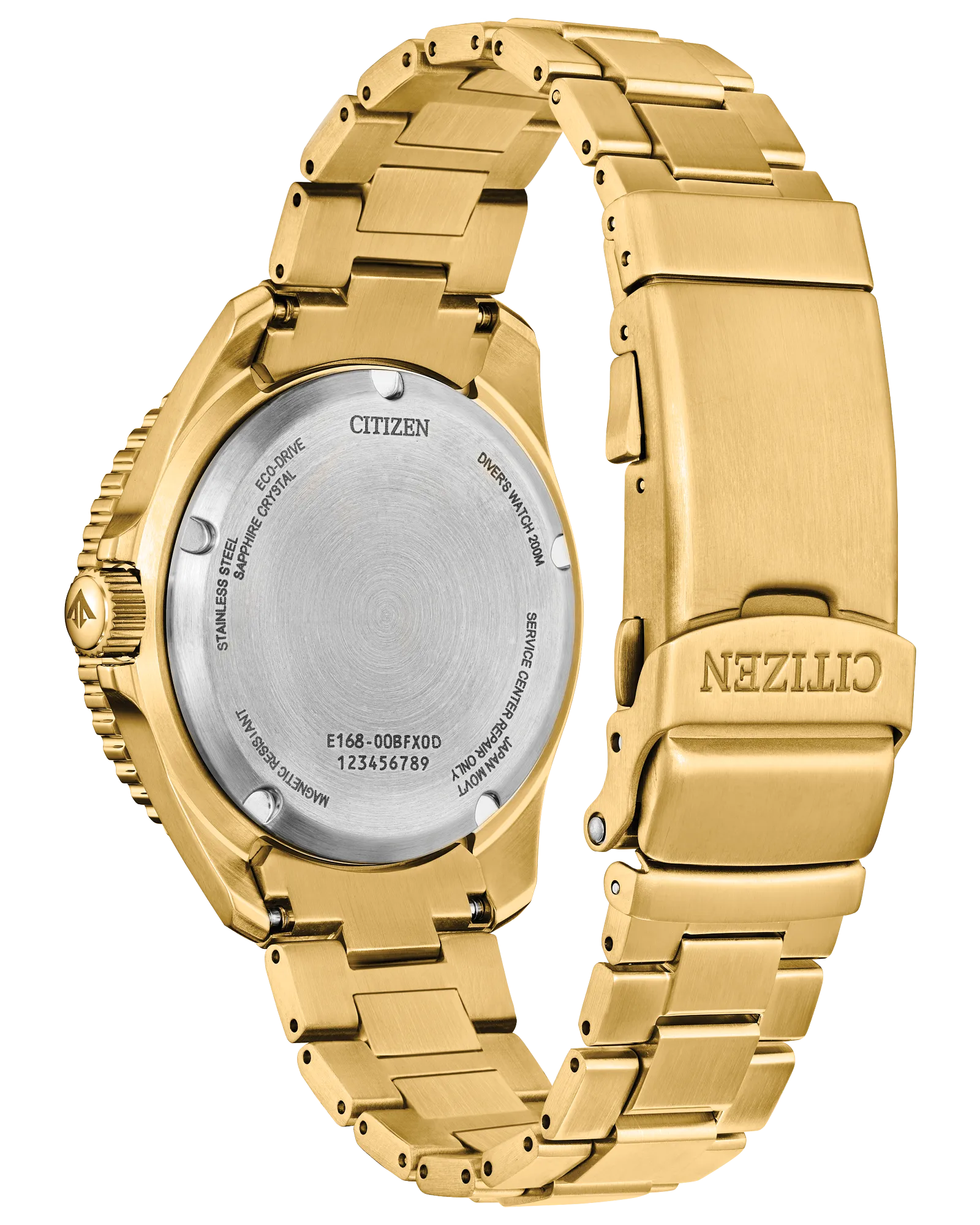 Good looks meet dive-ready functionality in the latest Promaster Dive timepiece. Comfortable on the wrist at 41mm in gold-tone stainless steel, this handsome tool watch is secured to the wrist via a matching triple-link bracelet and stylized in wear via a green unidirectional bezel. The gradient green dial hosts the highly visible applied hour markers, with plenty of lume and a unique handset easily showcases the time no matter the lighting conditions. A subtle date window at the 3 o'clock position provides daily utility. Featuring our Eco-Drive technology – sustainably powered by light, any light. Never needs a battery. This high-performance watch includes a wetsuit extender that doubles as a tool-less microadjust, is ISO compliant and water resistant up to 200 meters, and comes in an exclusive dive tank box. Caliber number E168.