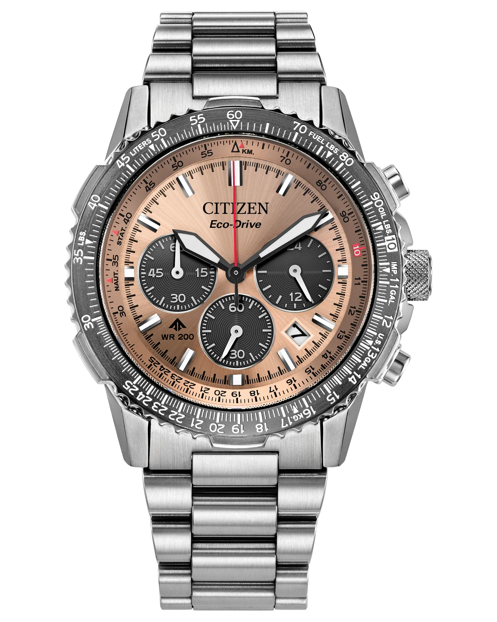 On the dial, a light COPPER colorway with red, black, and white accents adds to the watch's superior legibility, while a sapphire crystal and 200m of water resistance protect it all. Functions include a 1/5 second chronograph measuring up to 60 minutes, 12/24 hour time displays, and a date indicator, all powered by our Eco-Drive technology – sustainably powered by light and never needing a battery. Caliber B620.