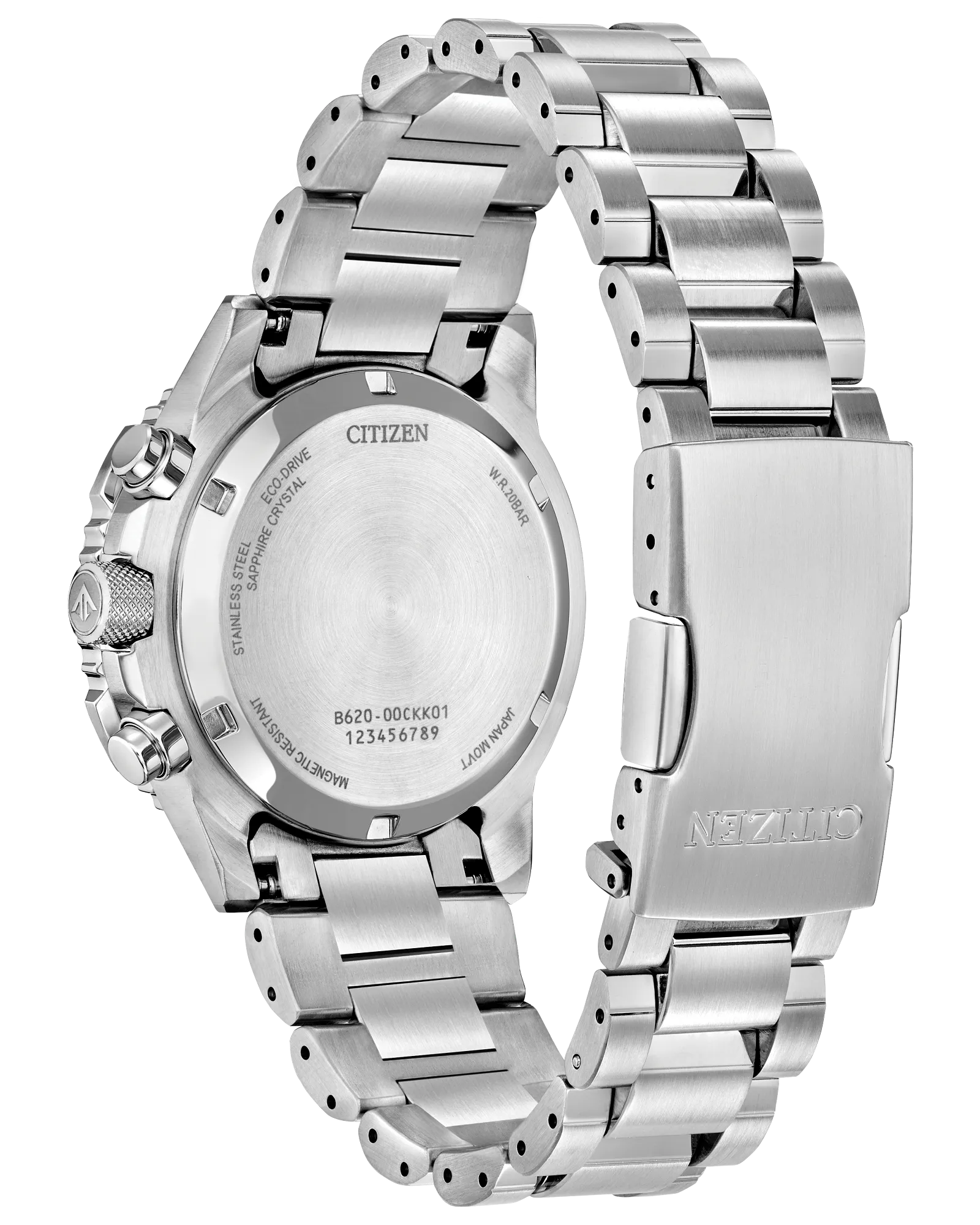 On the dial, a silver-tone colorway with red, black, and white accents adds to the watch's superior legibility, while a sapphire crystal and 200m of water resistance protect it all. Functions include a 1/5 second chronograph measuring up to 60 minutes, 12/24 hour time displays, and a date indicator, all powered by our Eco-Drive technology– sustainably powered by light and never needing a battery. Caliber B620.