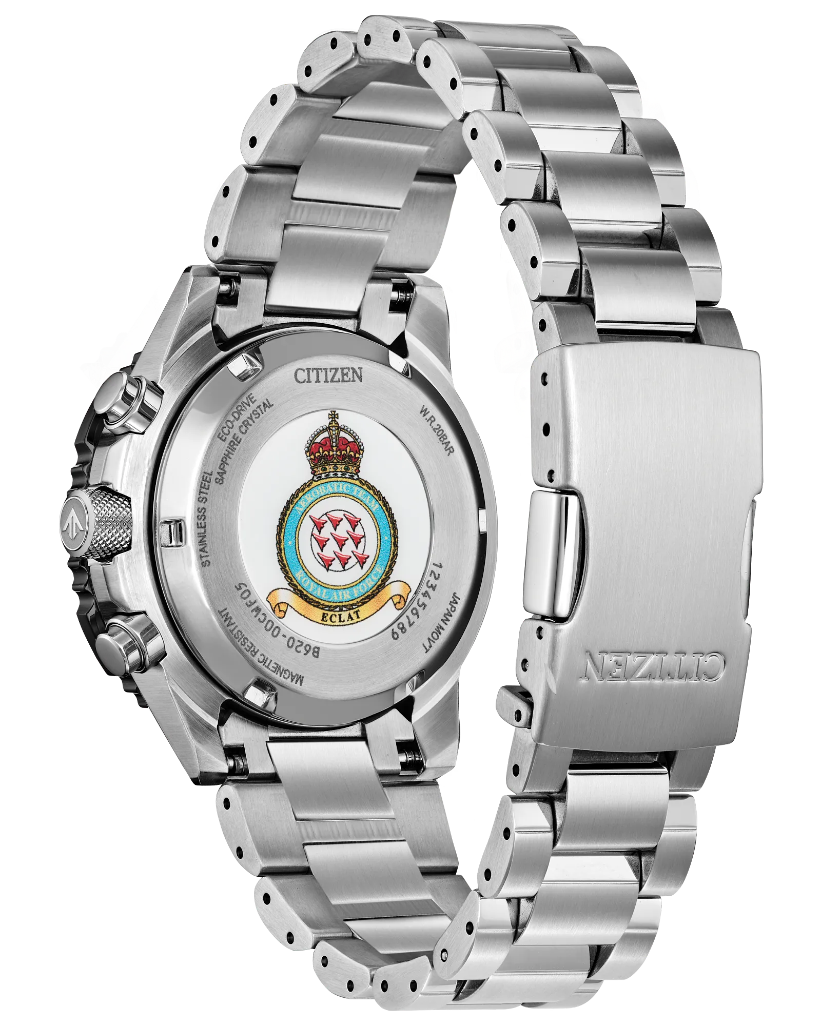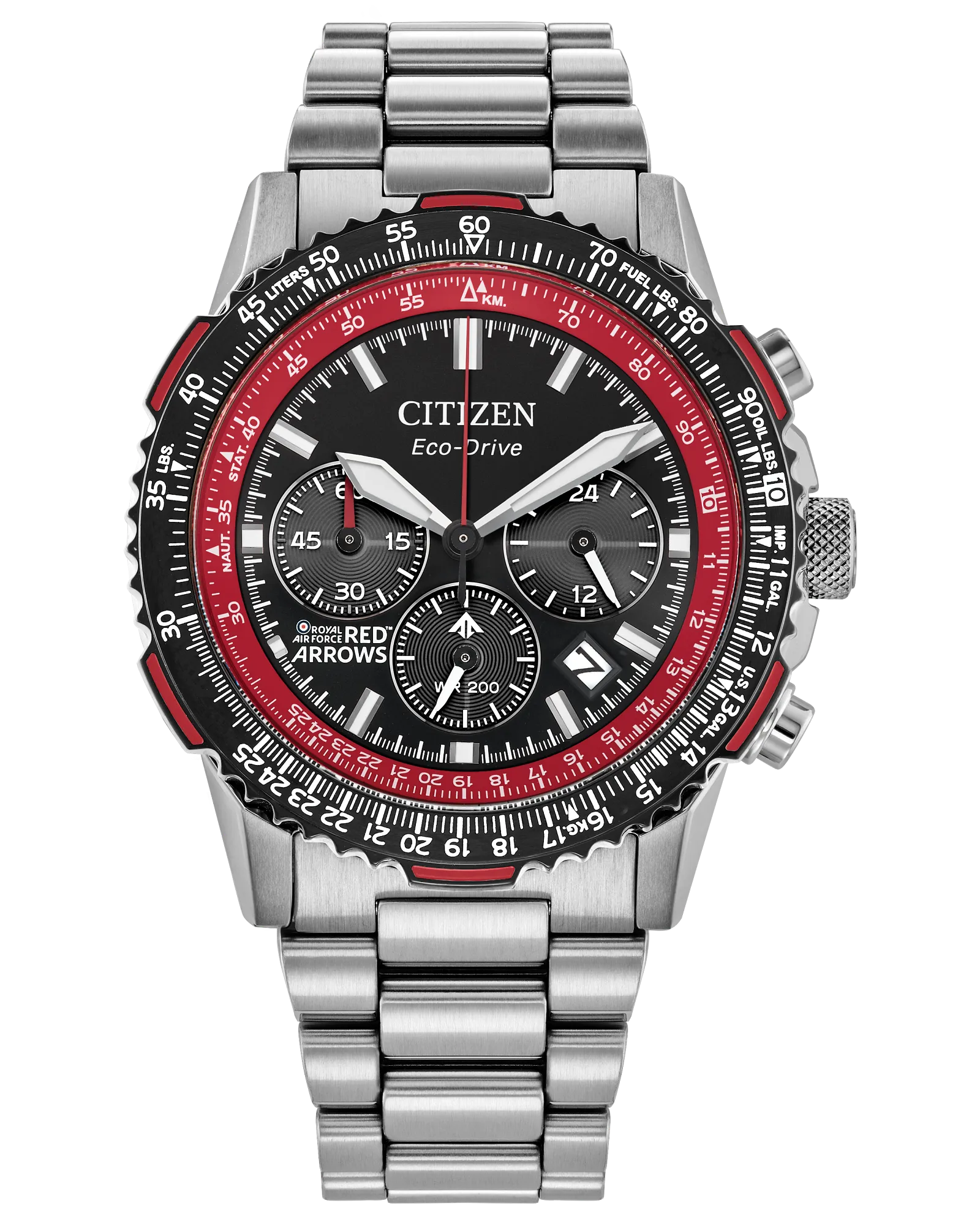 On the wrist, the watch's silver-tone stainless steel case measures 40mm in diameter, wearing boldly with its sharp faceting and satin finishing, while a slide-rule scale on the bidirectional black and red ion-plated bezel provides additional flight utility. A triple-link stainless steel bracelet secures the timepiece. On the dial, a Red Arrows colorway with white accents adds to the watch's superior legibility, while a sapphire crystal and 200m of water resistance protect it all. Functions include a 1/5 second chronograph measuring up to 60 minutes, 12/24 hour time displays, and a date indicator. The movement is protected via a Red Arrows' insignia-signed case back, and is powered by our proprietary Eco-Drive technology – sustainably powered by light and never needing a battery. Caliber B620.