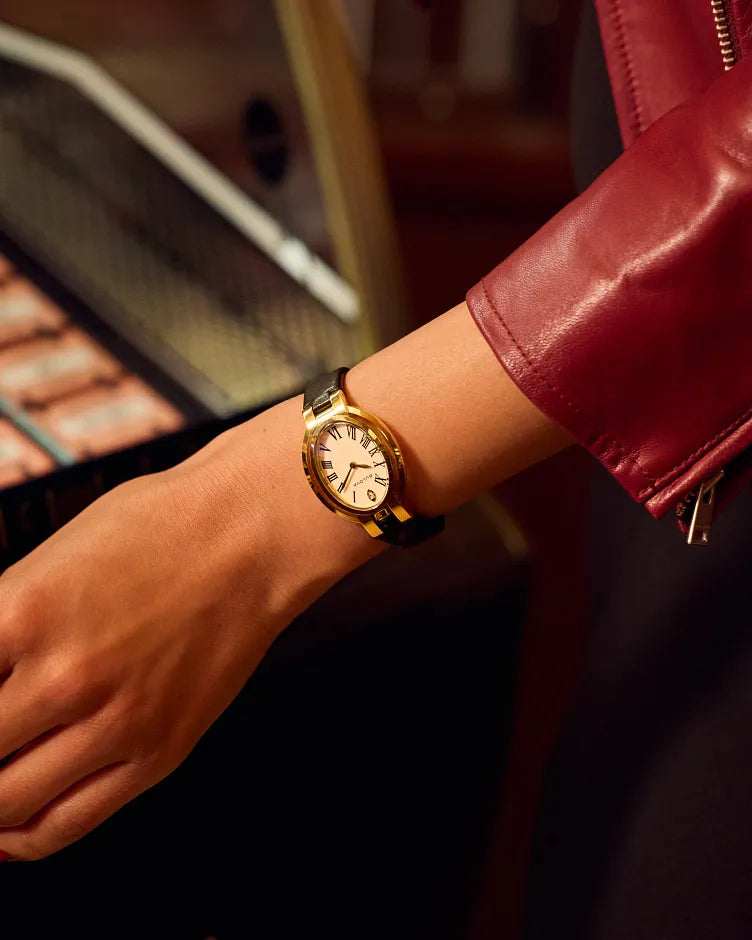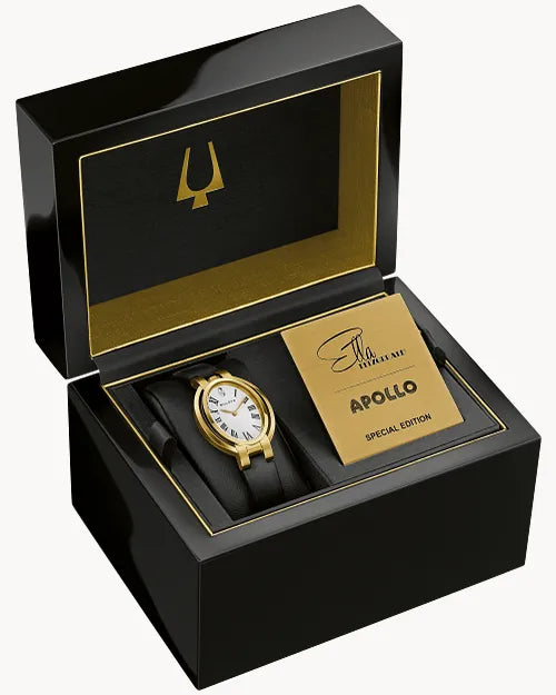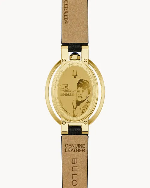 Capturing the soulful elegance of Ella Fitzgerald, this Bulova women’s special- edition Rubaiyat Ella Fitzgerald x Apollo timepiece commemorates the legendary singer’s historic debut at The Apollo’s Historic Theater. The fully polished oval gold-tone stainless steel case is surrounded by the signature Rubaiyat halo, adding a dynamic presence on the wrist. The 12 o’clock crown is set with a blue synthetic spinel cabochon, while a domed sapphire crystal ensures optimum clarity. The regal white enamel dial is appointed with Roman numerals and a diamond—Ella Fitzgerald’s birthstone—set in a marquise-shaped navette plate at 12 o’clock. The case back features an etched photo of the singer along with The Apollo logo and is paired with a subtly textured black calfskin leather strap and presented in a special black piano finished case. Take the stage and feel like a star with this incredible Rubaiyat Ella Fitzgerald x A