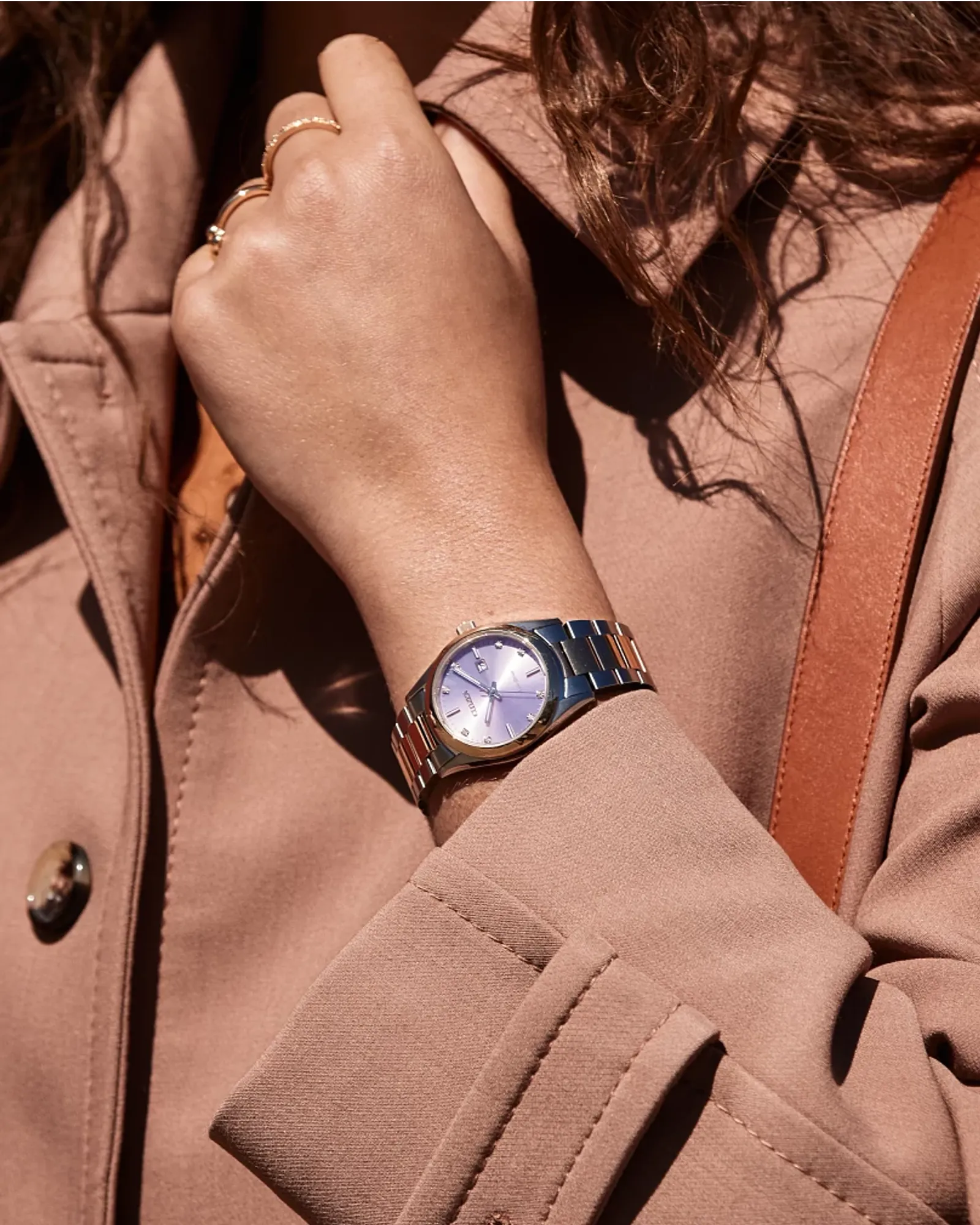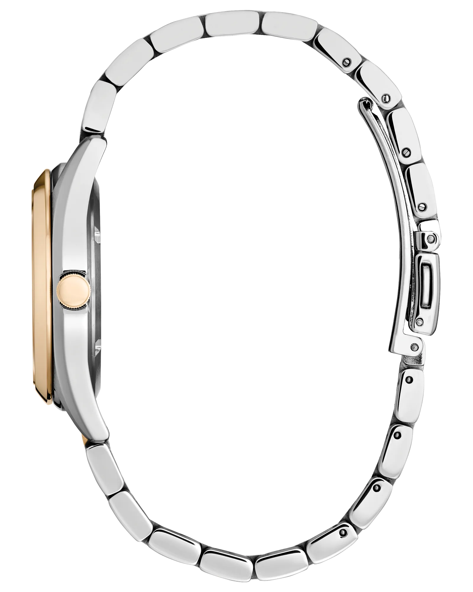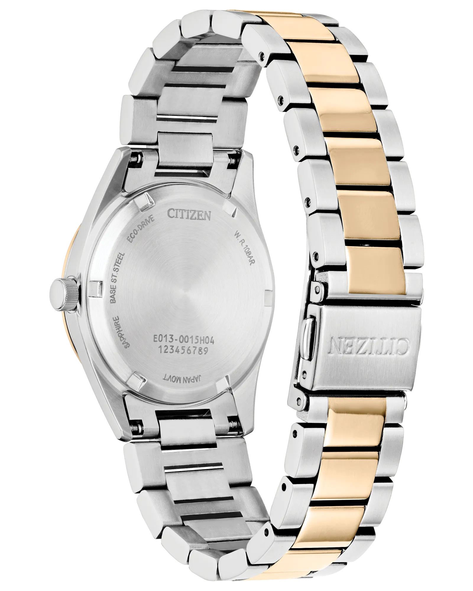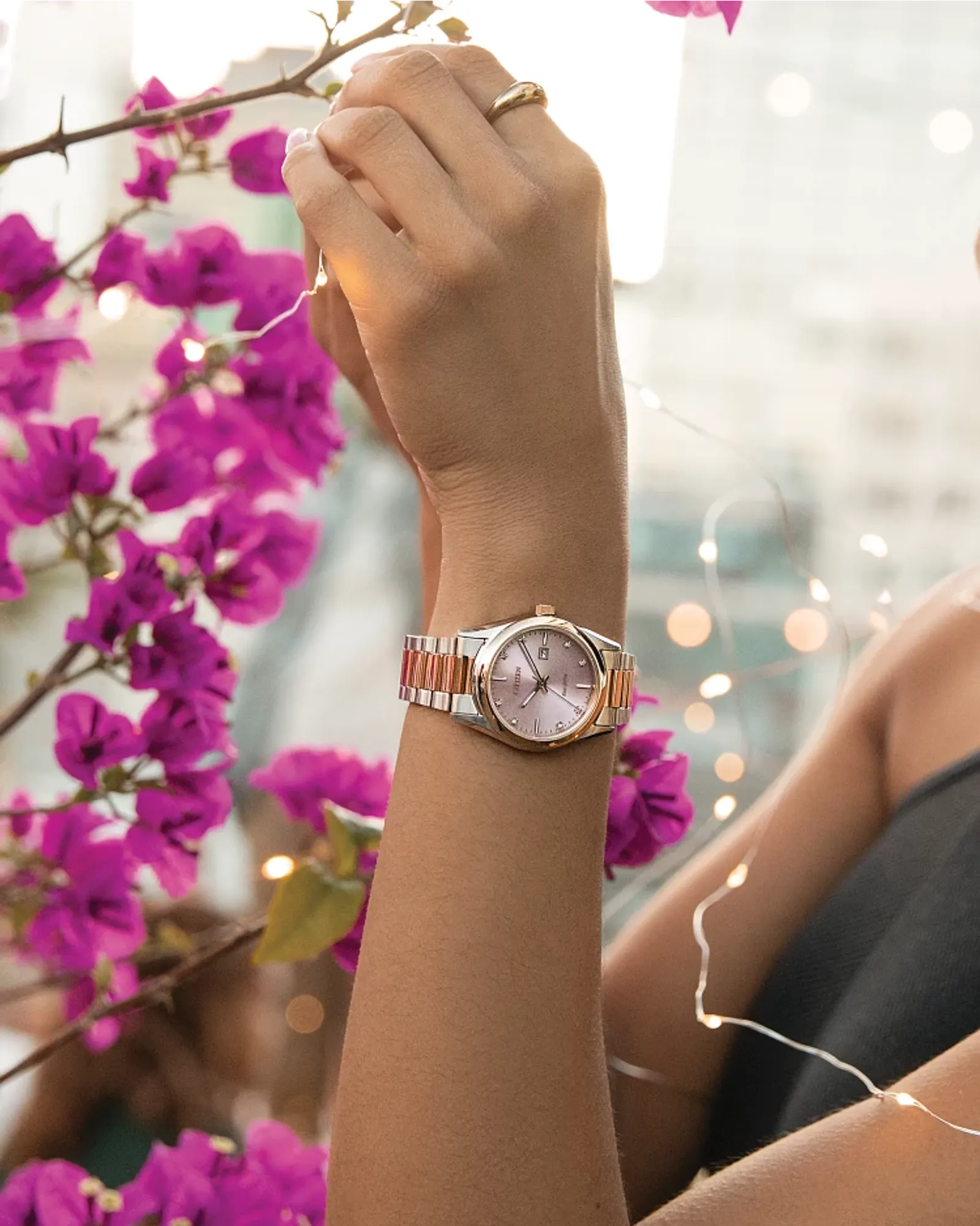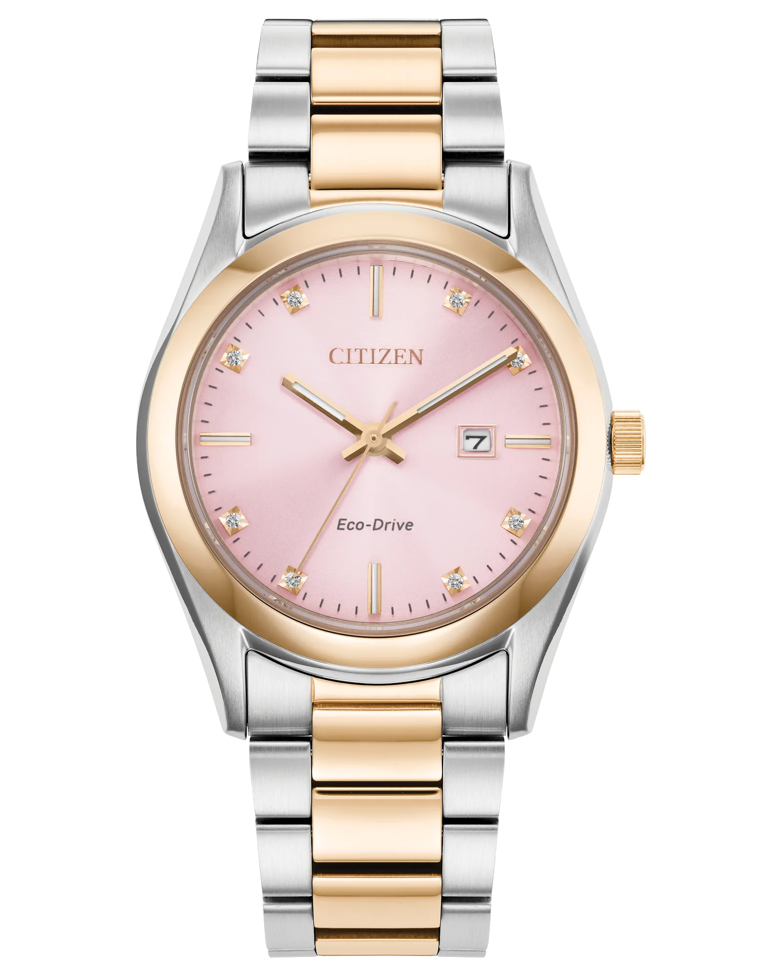 When sporty style meets luxury, you get this latest stunner from Citizen. Joining ready-for-anything wearability with feminine elegance, this time-and-date timepiece is the ultimate day-to-evening watch to wear. The two-tone stainless steel case measures 33mm in diameter and is presented on a matching, 3-link stainless steel bracelet for a sleek, versatile wear on the wrist. The radiant pink dial is characterized by its highly legible style and diamond accents, elevating the sporty wearer one step further. A water resistance up to 100 meters helps the dynamic watch maintain a host of functionality without compromising its alluring appearance. Powered by Citizen’s proprietary Eco-Drive technology to provide light-powered vitality continuously and sustainably without ever needing a battery. Caliber E013.