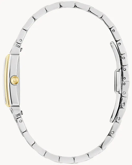 This all-new Bulova ladies’ timepiece adds new style to the already impressive Sutton Collection. The elegant two-tone stainless rectangular steel case with a silver-tone body and a gold-tone frame around the mineral crystal. The opalescent mother-of-pearl dial is accented with gold-tone hour markers and matching hands for a look of true sophistication. A matching five-link bracelet features a deployant closure with pushers for a perfect fit. This Bulova ladies’ timepiece is perfectly styled for the woman who is ready to make a statement.