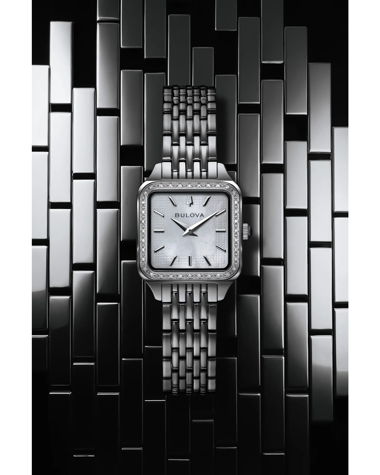 Timeless design meets modern flair with the Bulova ladies’ Classic Sutton Square. A graceful accent to any ensemble, the petite silver-tone stainless steel case has a soft square silhouette with a gem-set bezel with 36 1mm sparkling diamonds and a crown set with a blue cabochon. White mother-of-pearl provides an iridescent foundation for the time, which is indicated by polished dauphine hands and applied hour markers set upon an engaging translucent pattern. With a matching seven-row bracelet, this Bulova women’s timepiece is an essential part of every wardrobe.