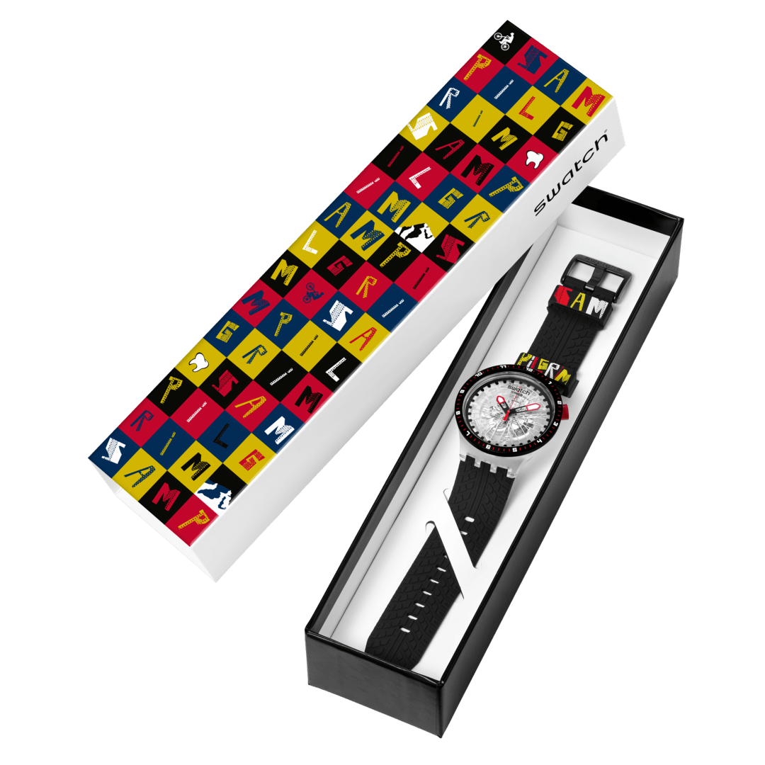 This sporty oversize watch is created in collaboration with Swatch Proteam athlete Sam Pilgrim. It features a transparent dial with multi-colored print, multi-colored hour and minute hands and a red seconds hand that all glow in the dark in a transparent matte biosourced case with biosourced glass. The case is accented by a matte black biosourced bezel with multi-colored print and a matte red crown with white print. The structured matte black strap has matte black loops with multi-colored print and a matte black half-buckle.