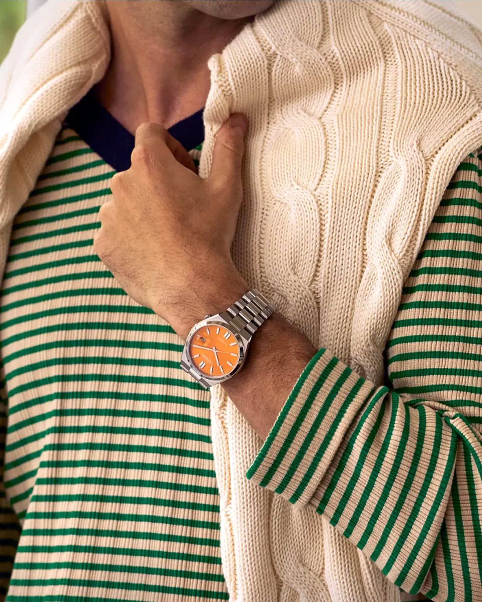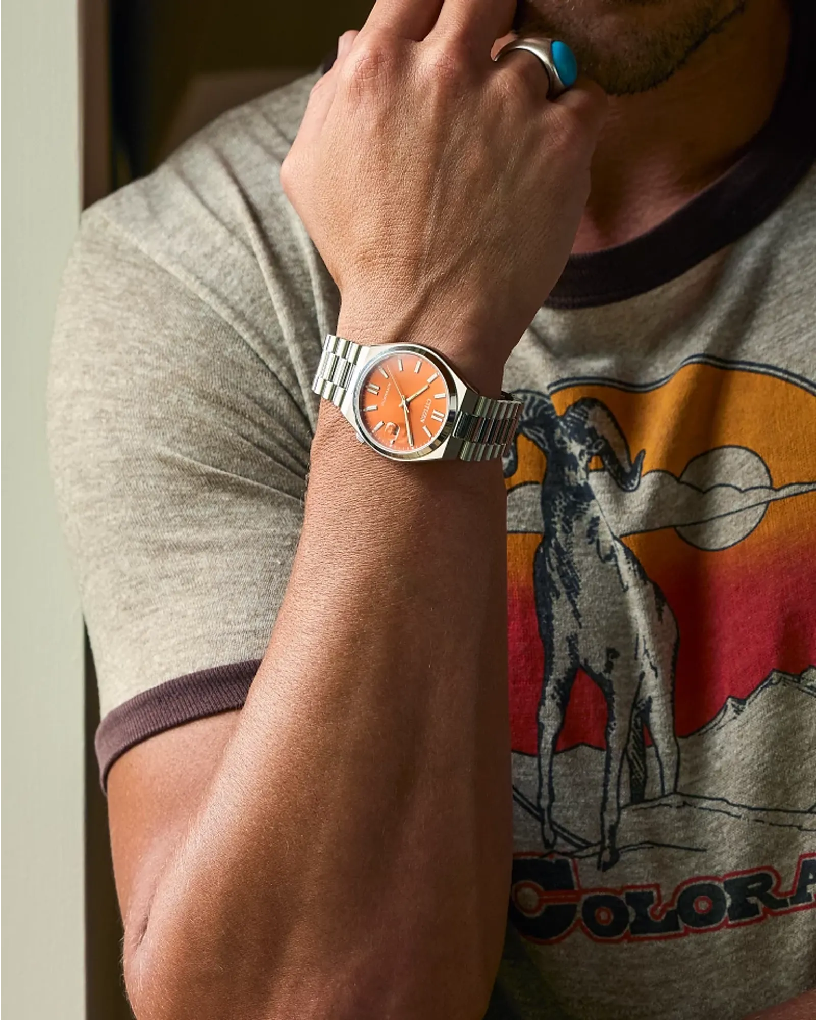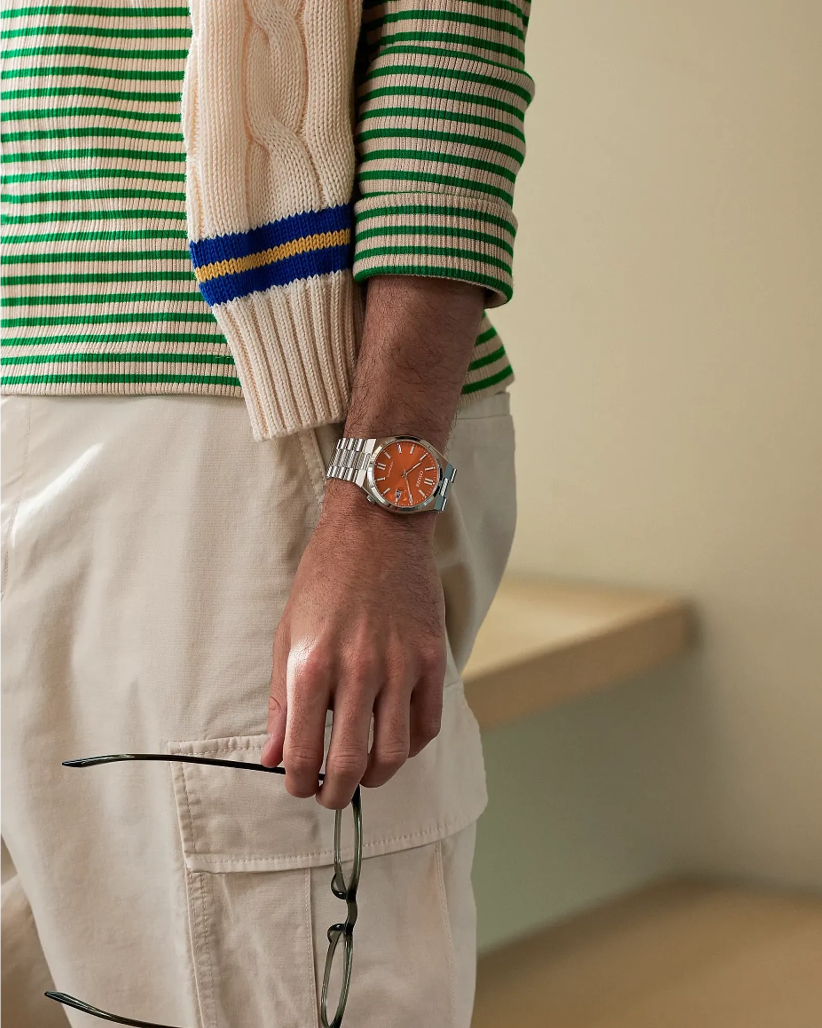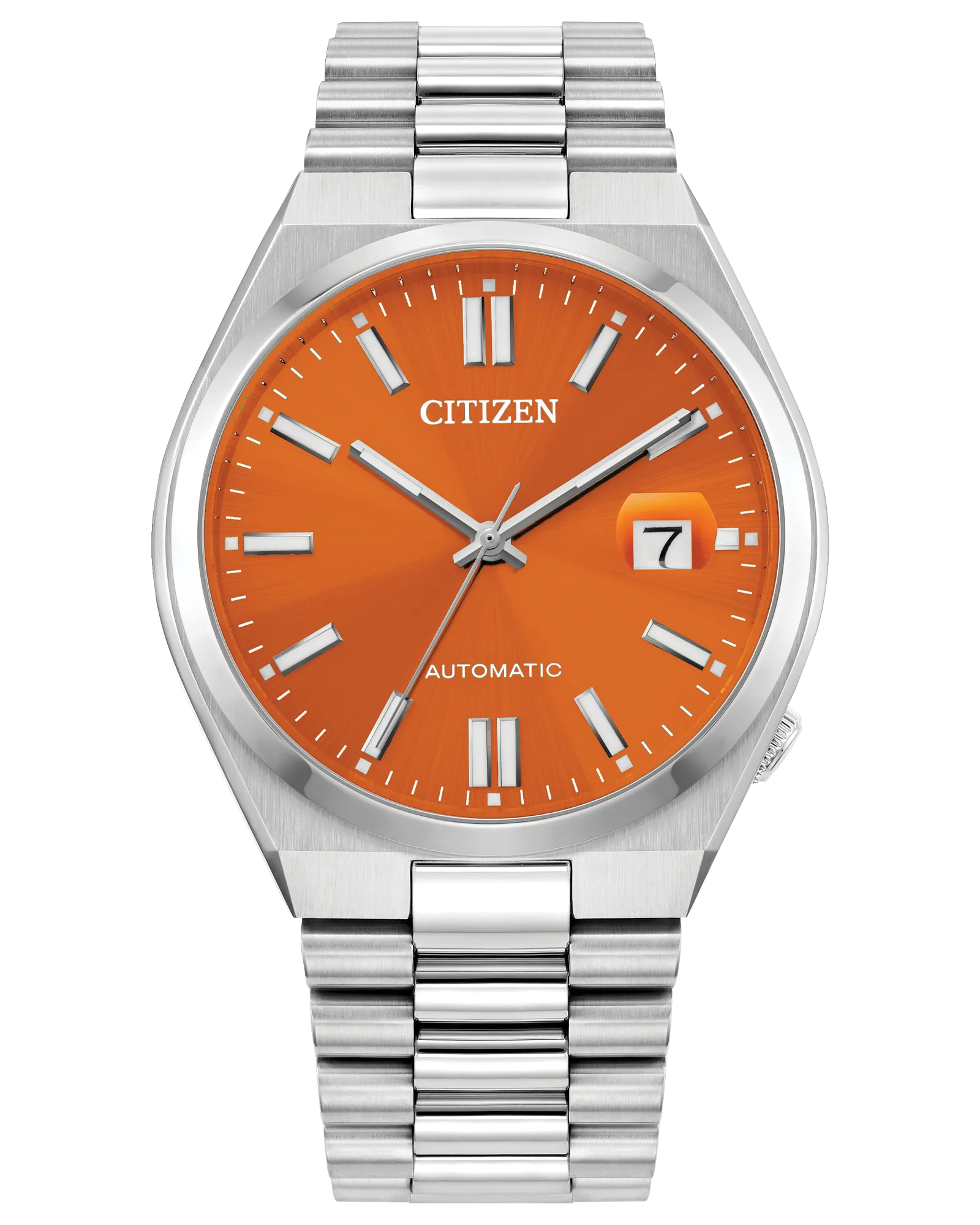 The TSUYOSA Automatic, from the NJ015 series, brings ultramodern sports styling right to your wrist. Executed in a versatile 40mm footprint, the sophisticated design of the watch makes a strong impression via a silver-tone stainless steel case and a seamlessly integrated, matching bracelet. Underneath an anti-reflective sapphire crystal, the sporty timepiece makes use of a sunray orange dial, with a 3 o’clock date window and contrasting silver-tone details adding to its classic aesthetic. Powered by an automatic movement and offering up to 50 meters of water resistance, the refined timepiece is a daily wearing choice ready for work, play, and everything in between. Caliber 8210.