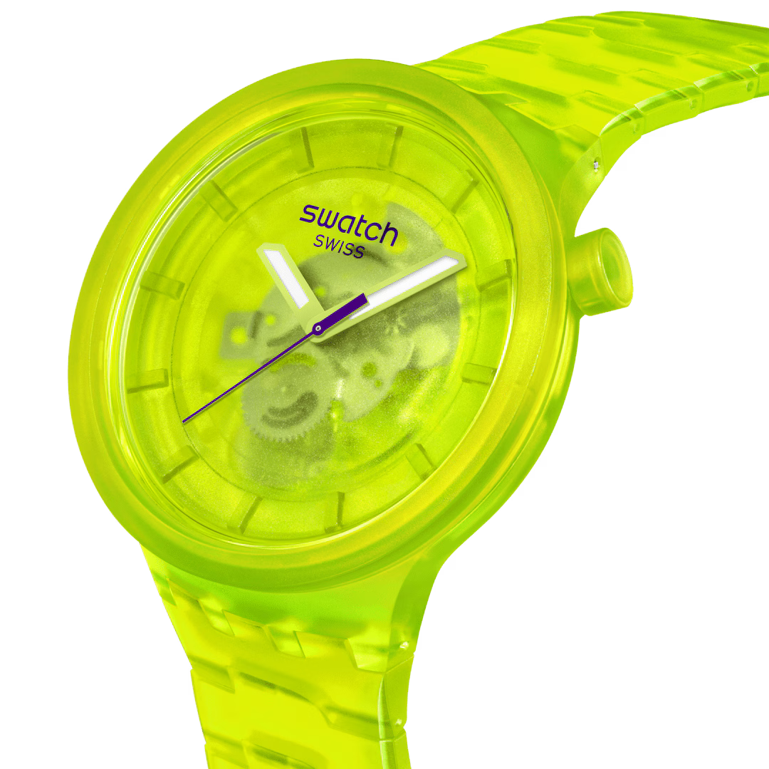This oversize yellow watch boasts an allover transparent look from its biosourced case, dial, and bezel to its biosourced bracelet with butterfly buckle. The transparent yellow biosourced dial gives a view of the movement while yellow hour and minute hands with glow in the dark and a contrasting purple seconds hand tell the time under the biosourced glass.